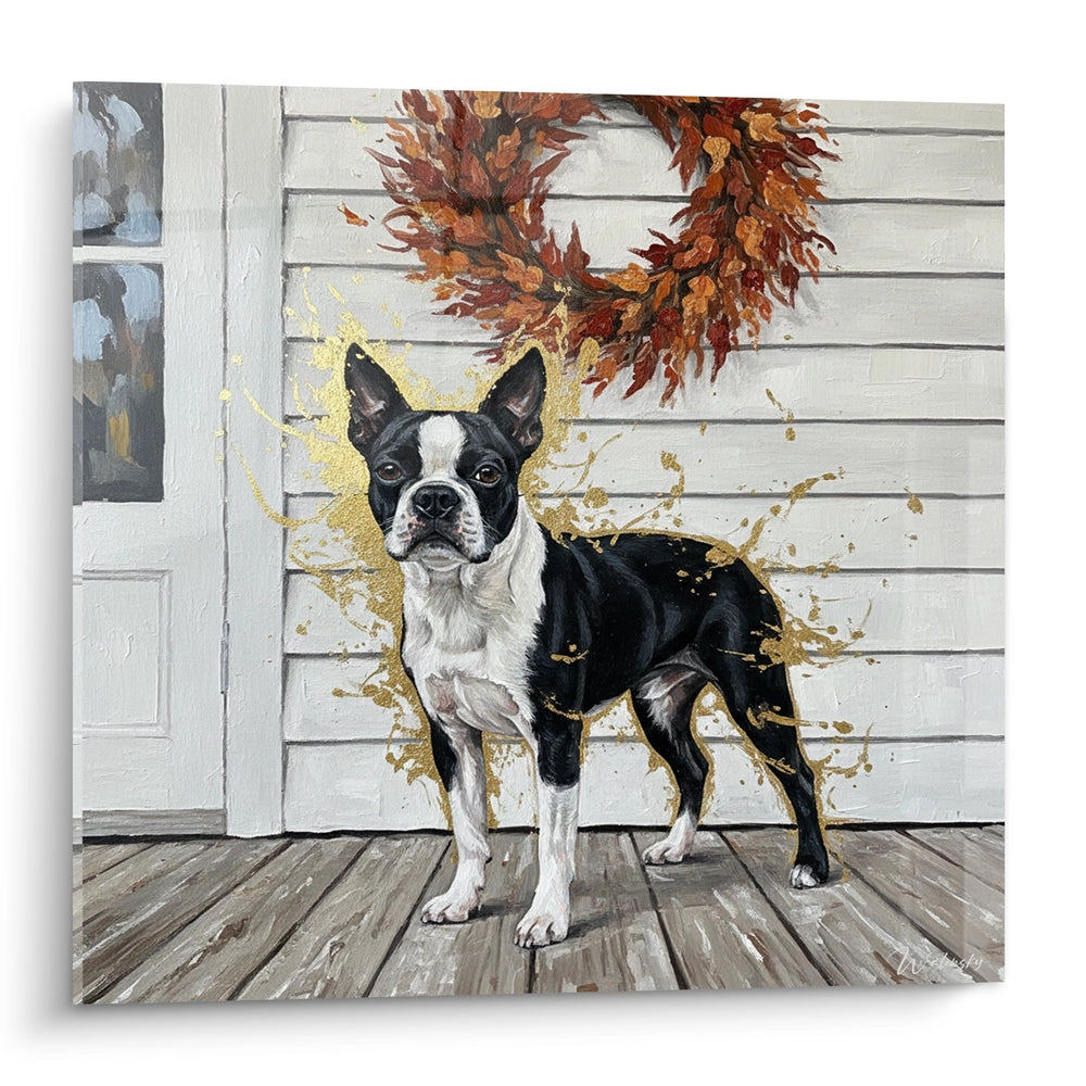 Ce tableau présente un Boston Terrier au pelage noir et blanc impeccablement contrasté, posant fièrement sur une terrasse aux planches de bois grisé. L'animal arbore le masque facial caractéristique de sa race, avec des marquages blancs parfaitement délimités sur le poitrail et le museau. Une magnifique couronne de feuillages automnaux orne le mur de bardage blanc, déclinant une palette de tons cuivrés, roux et dorés. Des projections dorées artistiques parsèment l'ensemble de la composition, créant des éclats lumineux qui se reflètent sur le pelage sombre et transforment cette scène réaliste en œuvre d'art contemporaine. La porte d'entrée avec ses carreaux vitrés et la fenêtre adjacente complètent ce décor résidentiel chaleureux, tandis que les nuances de gris du bois patiné contrastent harmonieusement avec la végétation flamboyante.