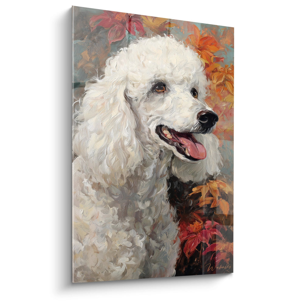 Tableau Caniche Blanc aux Feuillages Automnaux - Portrait Joyeux - Edition Caniche