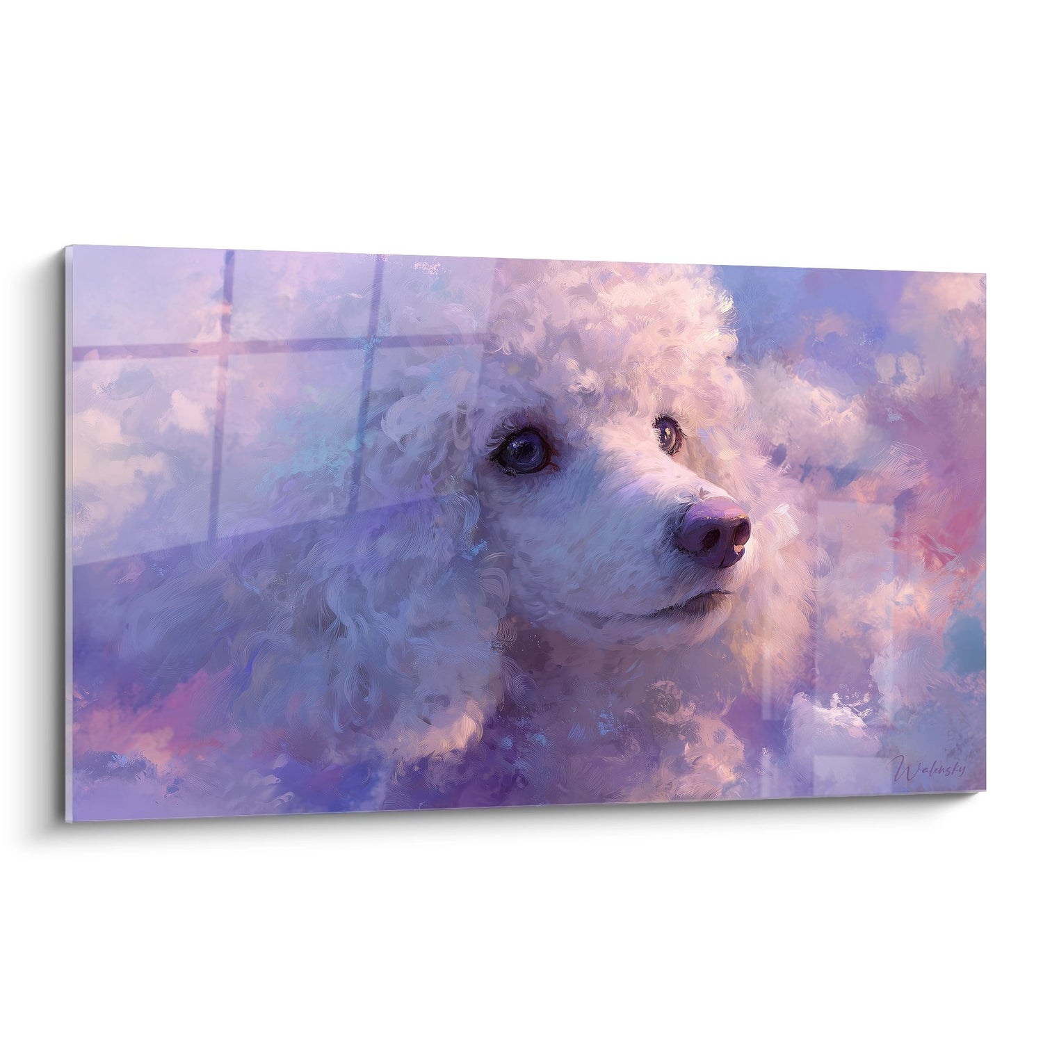 Les tons violets, mauves et roses qui baignent ce portrait créent une atmosphère onirique et poétique unique. Cette palette chromatique inattendue transforme un simple portrait animalier en œuvre d'art contemporaine. L'artiste a utilisé ces couleurs pour sublimer la texture bouclée du pelage et créer un effet de lumière vaporeuse qui donne au caniche une aura presque mystique.