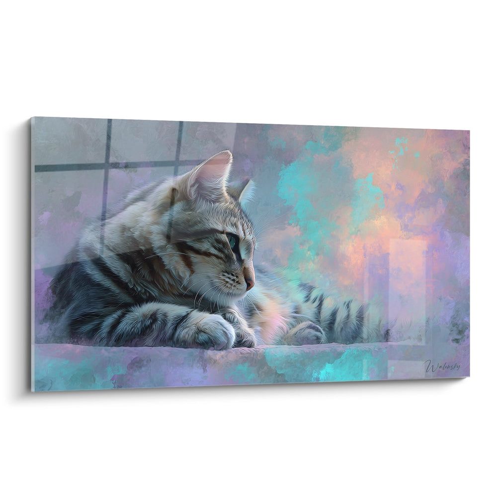 Les couleurs dominantes de ce tableau sont des teintes douces de bleu, violet et rose. Ces couleurs créent une atmosphère de rêve, mettant en valeur le pelage du chat tout en se fondant dans un fond abstrait, ce qui attire l'attention sans aucune distraction.