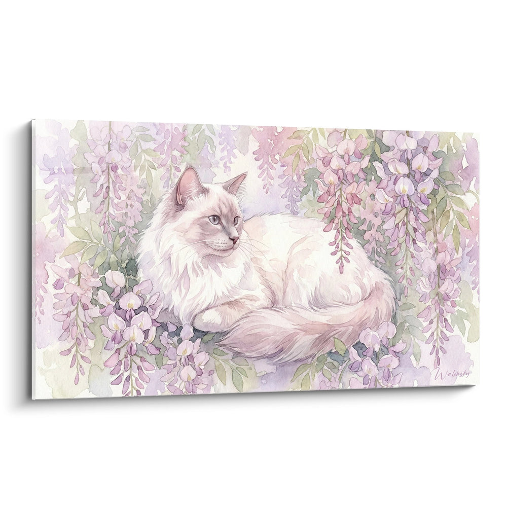 Ce tableau présente un chat Balinais, aux couleurs blanches et crème, lové confortablement parmi des fleurs de wisteria. Les teintes de rose et de lavande se mêlent harmonieusement, créant un tableau doux et champêtre. La composition, avec le chat en position centrale, attire le regard, tandis que l'arrière-plan floral ajoute de la profondeur et de la texture à l'œuvre.