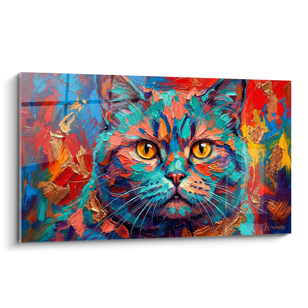 Le tableau de ce chat British shorthair vous plonge dans un univers vibrant et coloré. Ses yeux dorés semblent vous observer, vous engageant dans un moment d'émerveillement. La combinaison audacieuse de couleurs évoque une sensation de joie et de vivacité.
