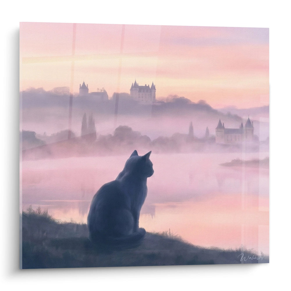 Ce tableau capture un chat Chartreux assis au bord d'un lac, contemplant un paysage embrumé. Les nuances de rose et de violet priment, offrant une palette chromatique délicate. La brume se superpose aux châteaux en arrière-plan, créant un effet de profondeur. En combinant lumière douce et ombres raffinées, l'œuvre invite à une réflexion zen.