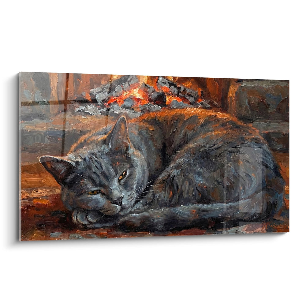 Ce tableau, avec sa représentation d'un chat Chartreux au pelage gris dans une ambiance chaleureuse, apporte une sensation de douceur et de tranquillité. Les couleurs chaudes de l'arrière-plan comme les nuances orange et rouge du feu créent un asile visuel qui invite à la détente.