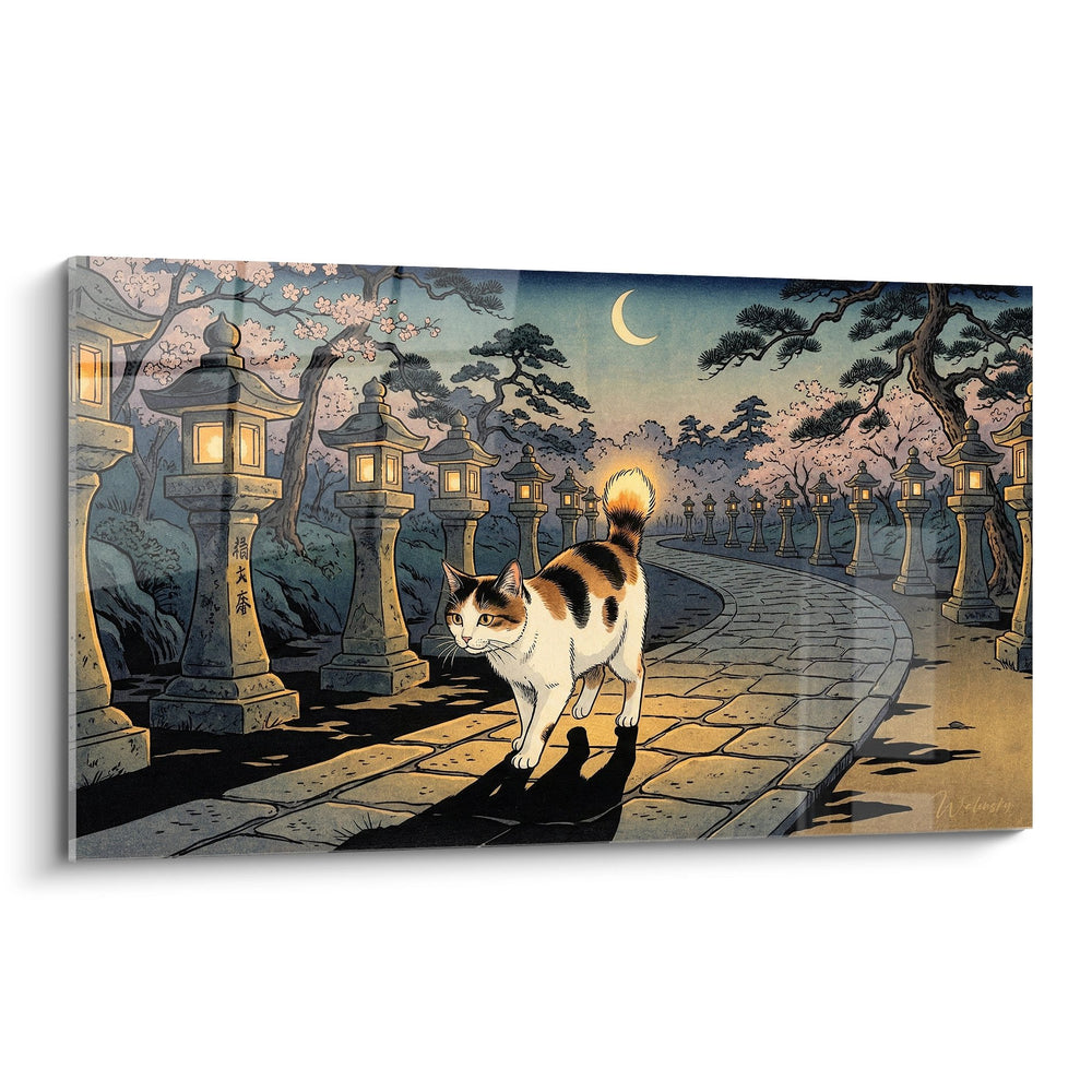 Plongez dans l'univers paisible de ce tableau, mettant en avant un chat Japanese Bobtail flânant sous un ciel étoilé. Les silhouettes élégantes des lanternes asiatiques ajoutent une aura mystique à cette scène nocturne.