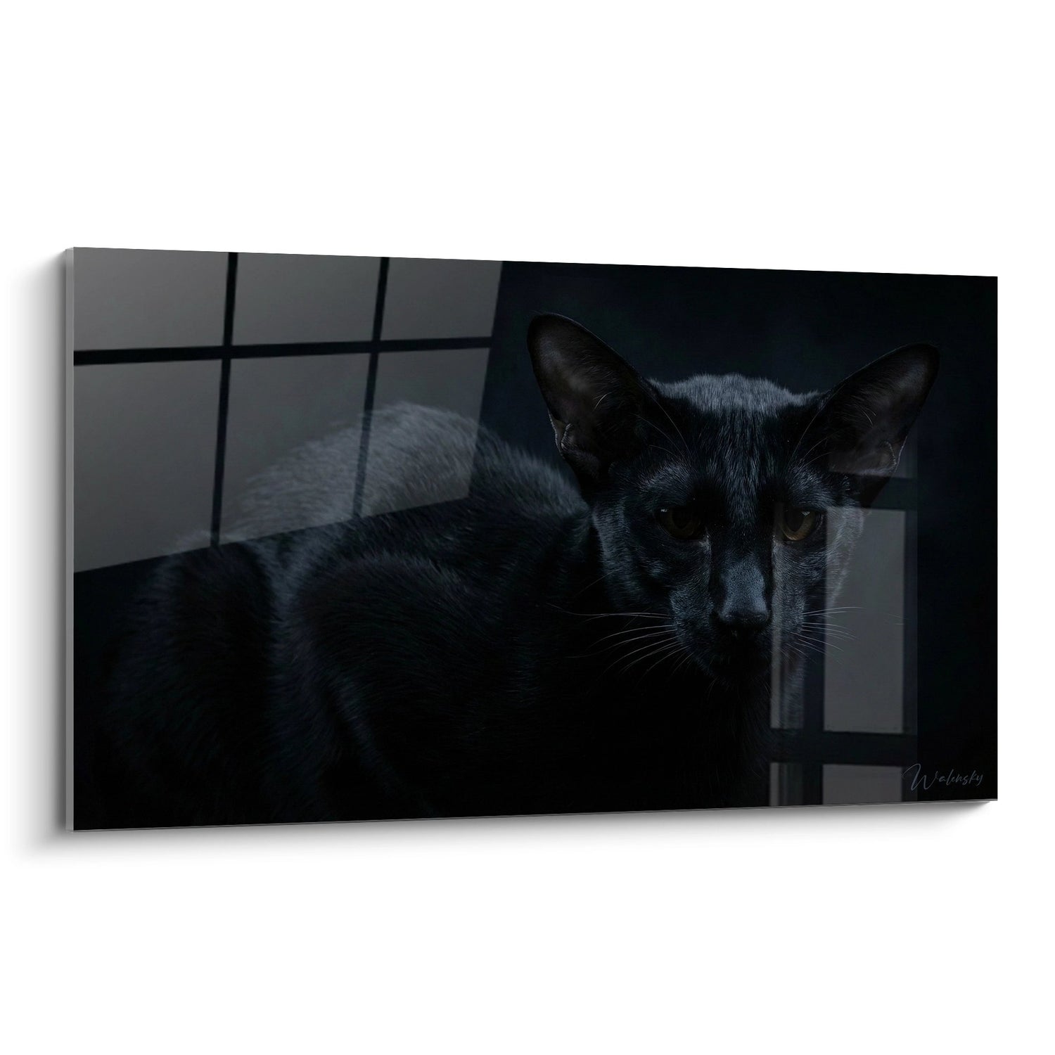 Ce tableau présente un chat Oriental Shorthair au pelage noir brillant, qui s'intègre harmonieusement dans un décor aux teintes sombres. Les reflets subtils apportent une sensation de profondeur, accentuant le détail des yeux brillants. La composition est renforcée par une utilisation audacieuse de l'ombre, créant une atmosphère à la fois mystérieuse et sereine, idéale pour un espace contemporain.