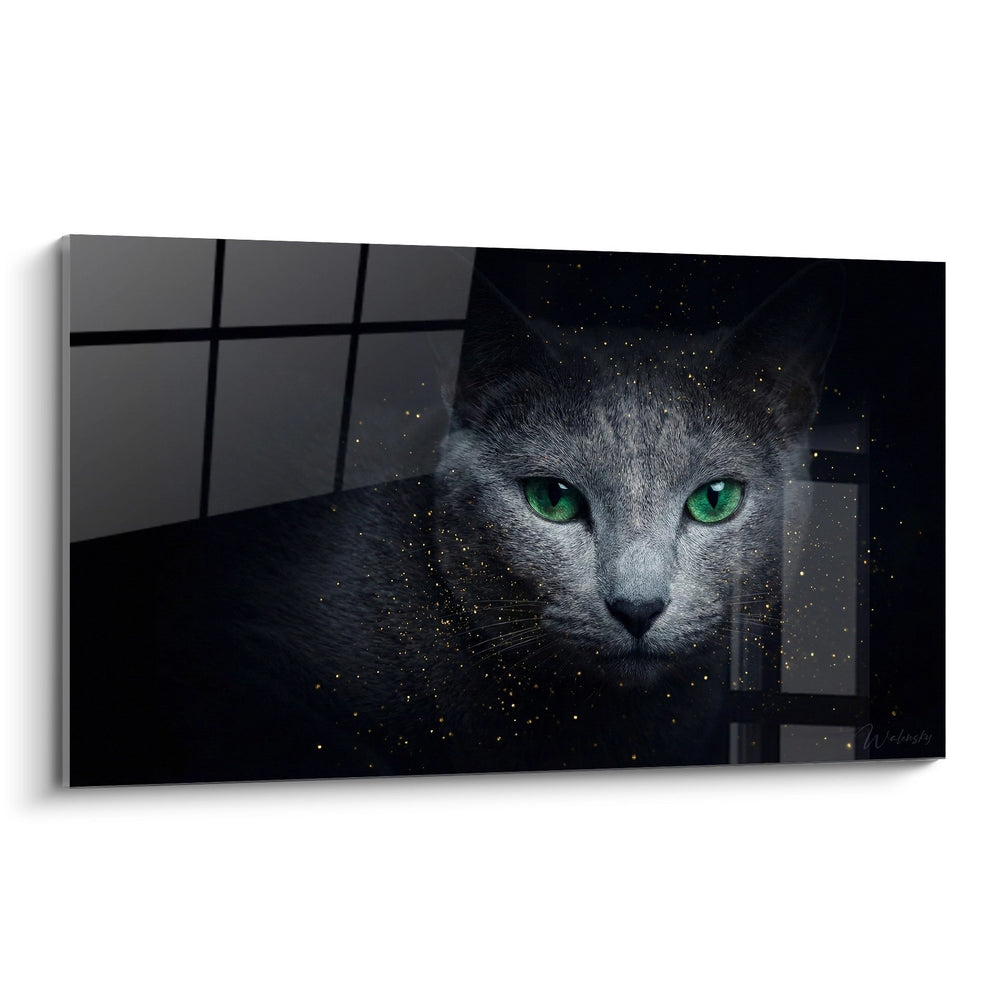 Couleurs dominantes : le gris profond du chat se marie avec un fond sombre. Les particules dorées ajoutent une touche de magie, attirant l’œil vers le visage du félin. La composition se concentre sur le regard pénétrant du chat, illuminé par des éclats de lumière. Ce tableau évoque une ambiance mystique grâce à son utilisation du noir et des reflets d'or, créant des contrastes saisissants.