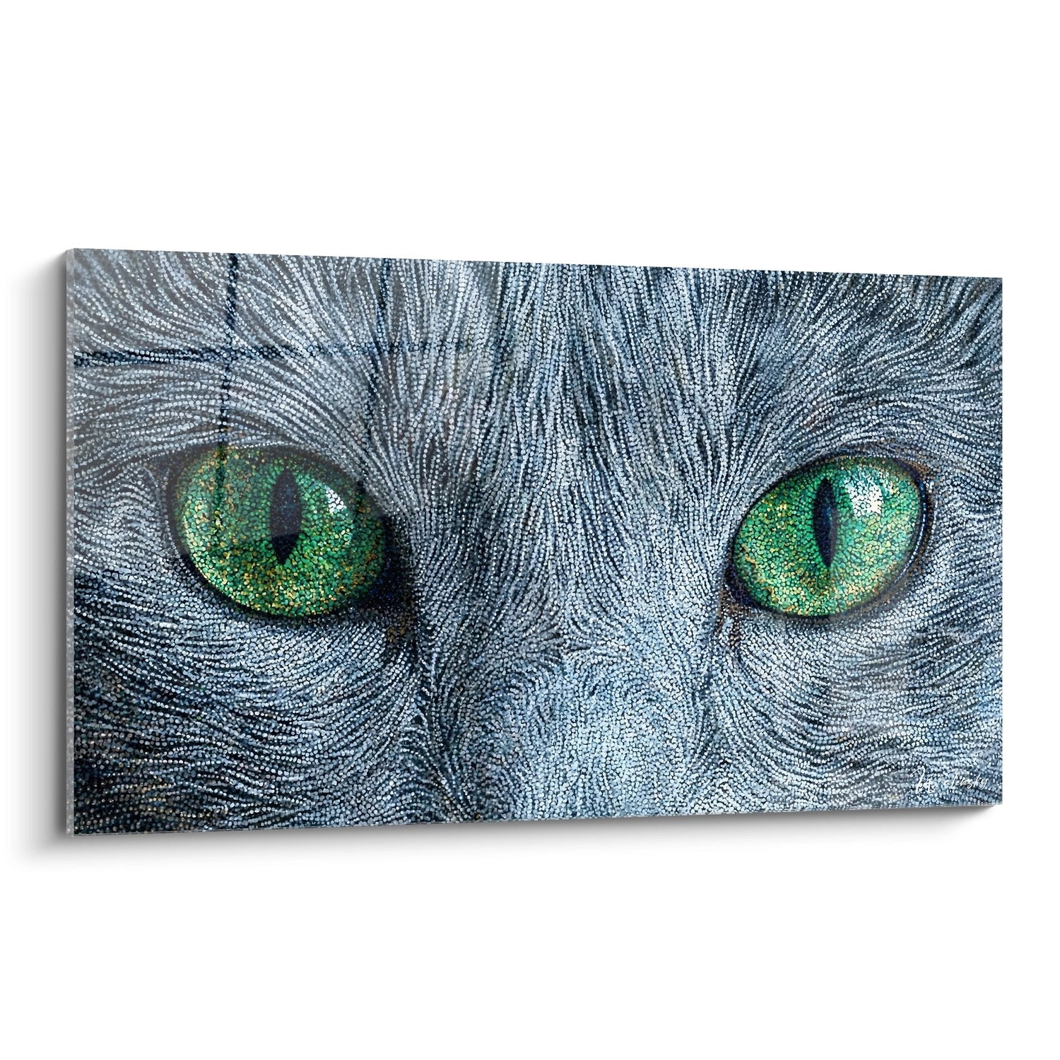 Ce tableau présente de manière réaliste un chat avec un pelage gris délicat. Les teintes de vert des yeux ressortent brillamment contre la douceur du fond, créant un magnifique contraste. La finesse des traits rend l'œuvre particulièrement expressive, décrivant chaque détail avec une précision remarquable, notamment dans le regard perçant de l'animal.
