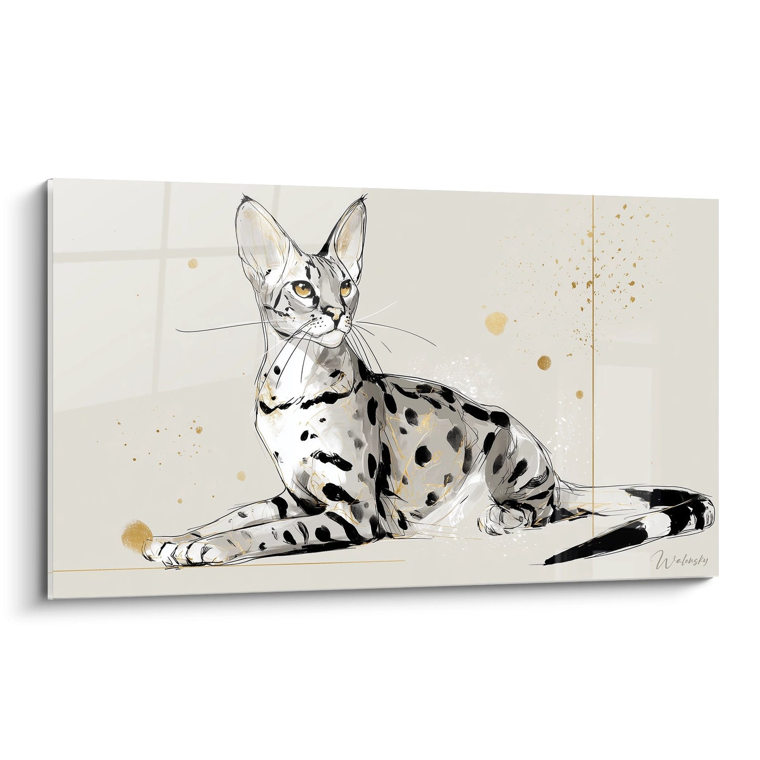 Le tableau adopte une approche artistique moderne et minimaliste, mêlant des touches de dessin et de peinture aquarelle. Cette fusion éclaire le chat Savannah d’une manière à la fois élégante et artistique.