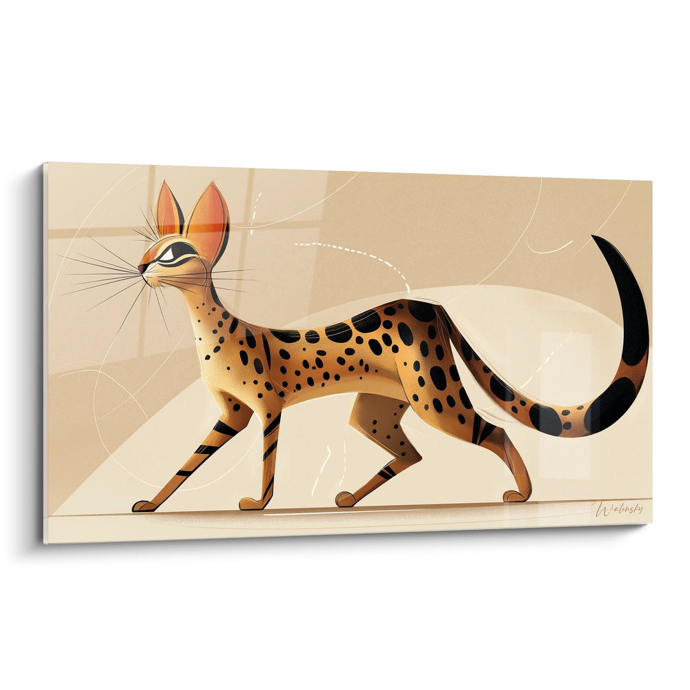 Cette œuvre présente une scène fascinante avec un chat Savannah en pleine démarche, évoquant une sensation de liberté et de vitalité. La représentation stylisée et les couleurs douces insufflent une atmosphère apaisante, idéale pour embellir votre intérieur.