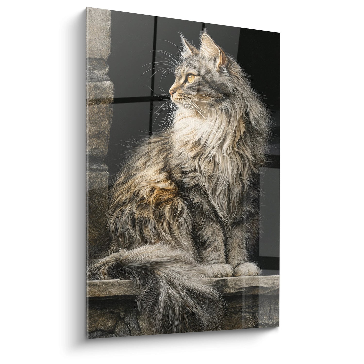 Ce tableau présente un chat Sibérien aux nuances de gris et de beige, capturant la lumière de manière fascinante sur son pelage. Les délicates mèches de fourrure créent un mouvement visuel, tandis que la posture fière du félin ajoute une dimension noble à l'œuvre.
