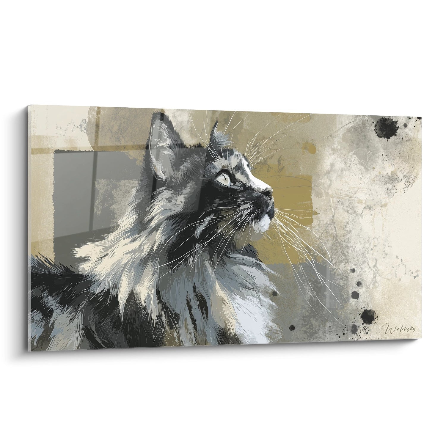 Cette œuvre présente un chat Sibérien en pleine contemplation, mettant en avant un mélange de gris et de beige. La palette chromatique est subtile, avec des éclats de couleurs douces qui apportent une lumière apaisante. Les textures et les jeux de lumière ajoutent du relief à ce portrait, avec une finesse qui attire le regard.