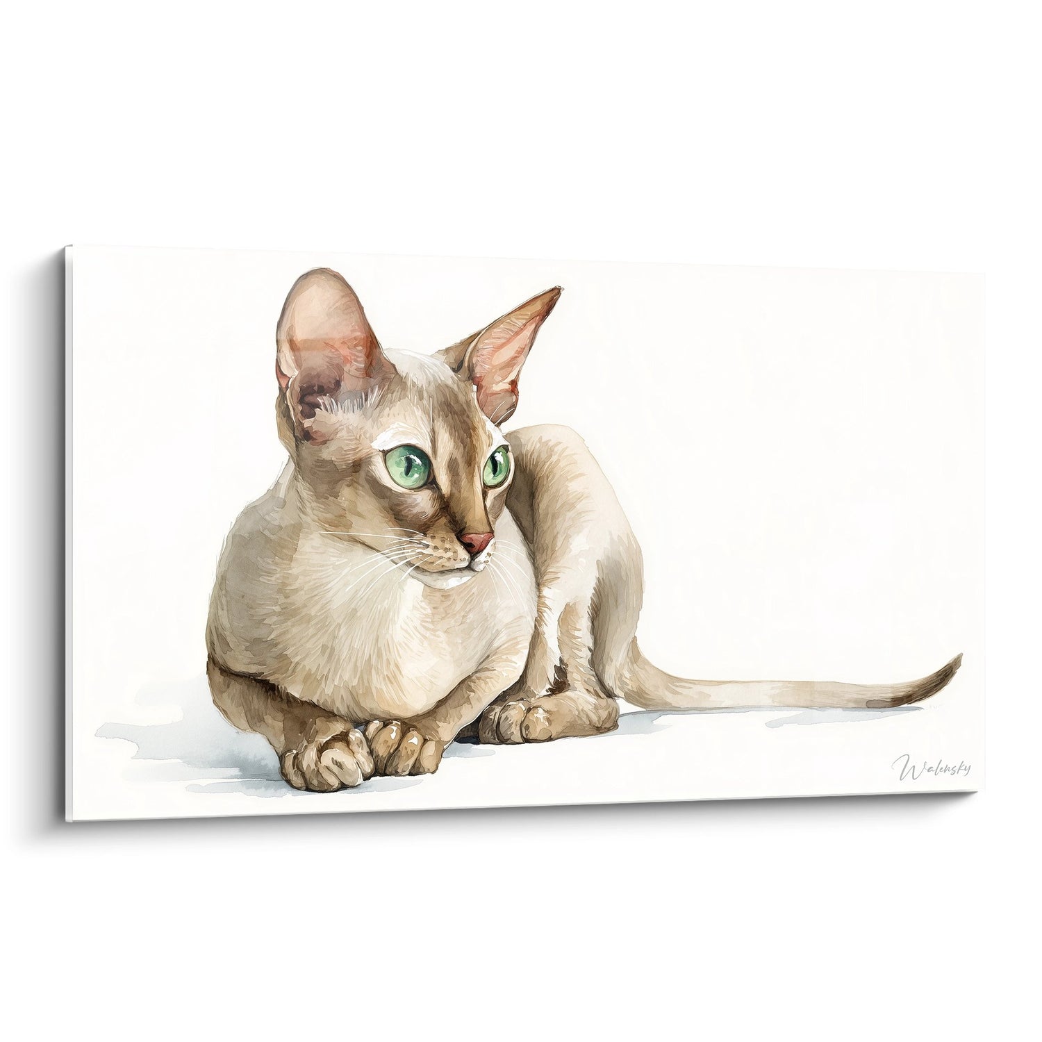 Les yeux verts remarquablement expressifs du chat sont un point focal de l'œuvre. La texture délicate de son pelage, rendue avec soin, met en valeur la finesse des traits caractéristiques de cette race.