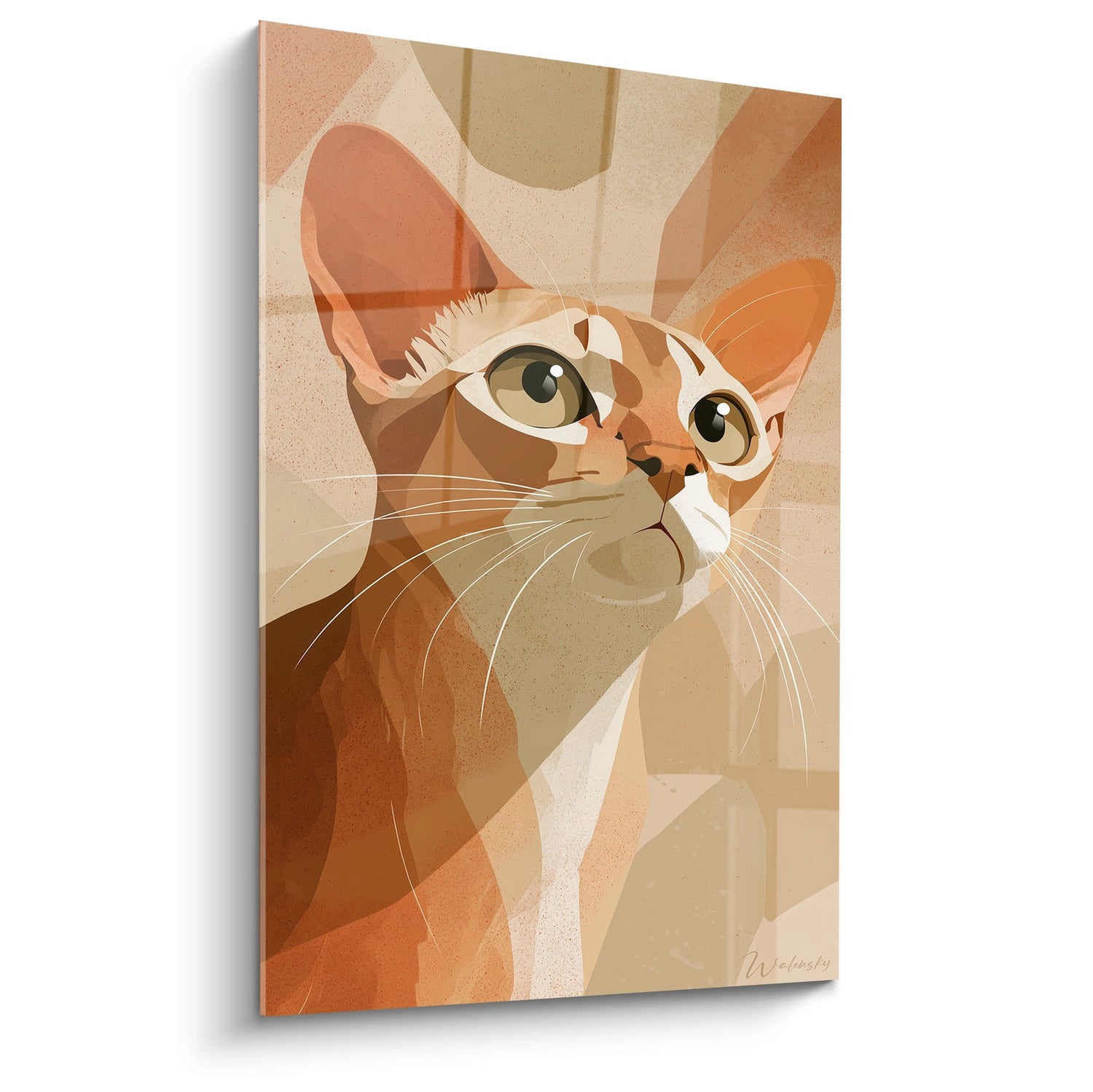 Ce tableau présente un chat Singapura d'une beauté délicate, capturé avec des tons beiges et orange. La composition géométrique souligne ses traits, tandis que les jeux de lumière ajoutent de la dimension. Le contraste entre les couleurs douces et les formes nettes rend l'œuvre moderne et accessible.