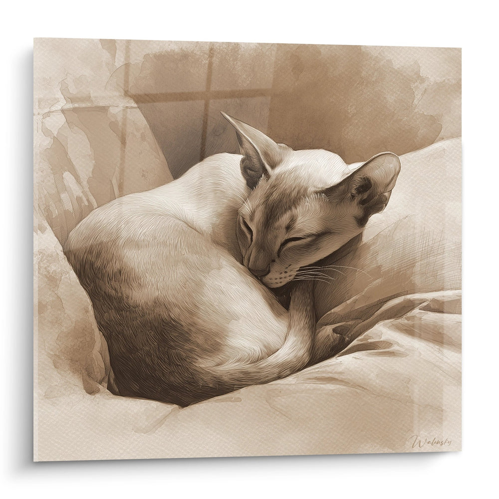 Ce tableau met en avant un chat Singapura délicatement enroulé, illustrant la tranquillité du félin. Les détails réalistes de son pelage et l’arrière-plan doux contribuent à créer une composition visuelle harmonieuse.
