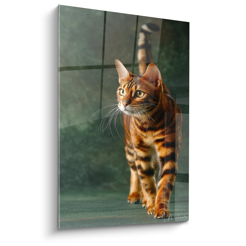 Ce tableau du chat Toyger évoque une grande élégance et une curiosité naturelle. Le regard perçant du chat et sa posture dynamique suggèrent un mélange de grâce et d'énergie, ce qui en fait une pièce captivante pour toute pièce.