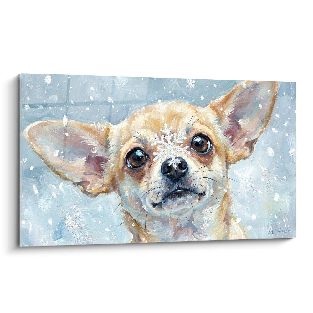 Ces flocons blancs délicatement posés sur le museau et autour des yeux ne sont pas anodins. Ils symbolisent la fragilité et l'innocence, rappelant la petitesse de ce chihuahua face aux éléments naturels. Cette poésie visuelle évoque l'enfance et la pureté, créant une atmosphère de protection et de bienveillance dans votre espace de vie.