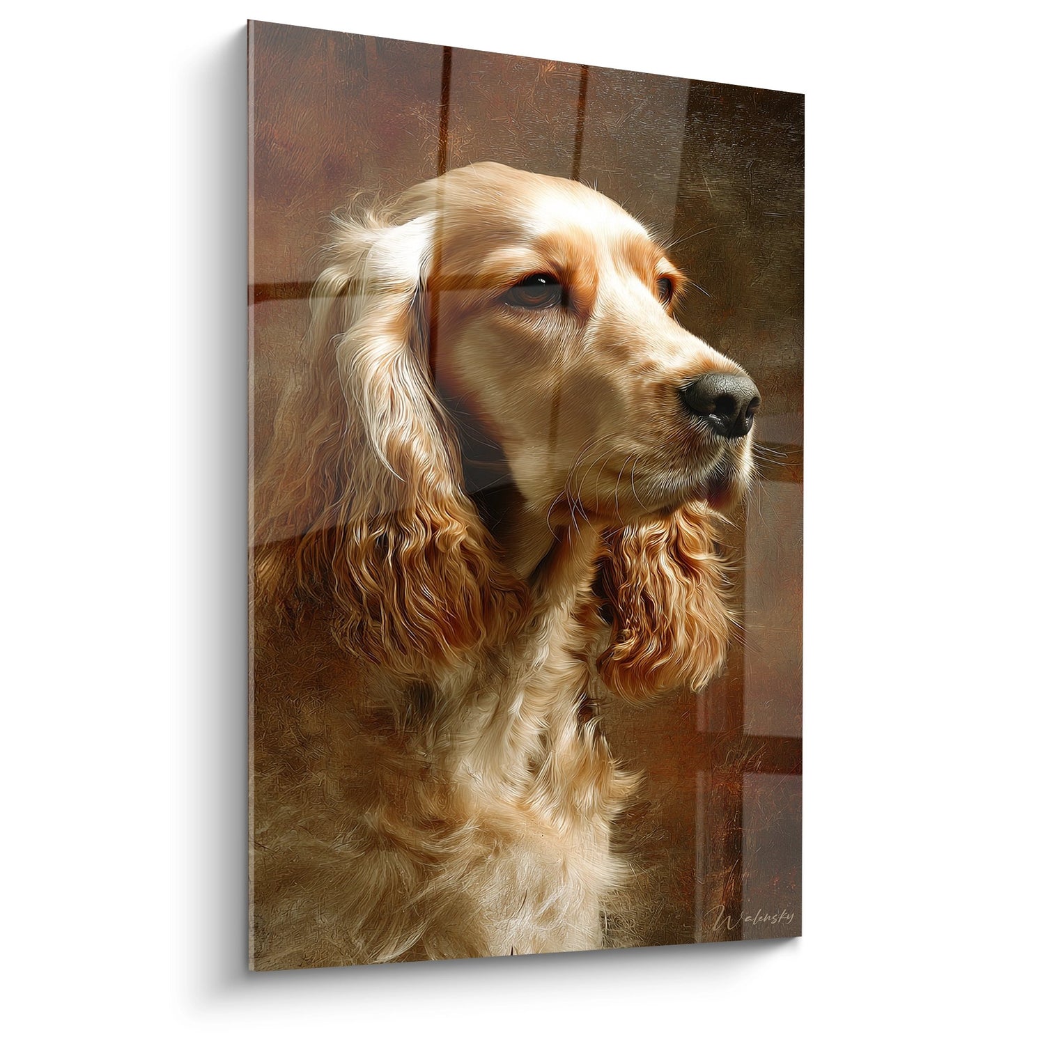 Ce tableau attire particulièrement les collectionneurs de portraits animaliers raffinés et les propriétaires de Cockers qui reconnaîtront l'authenticité de l'expression. Les amateurs d'art figuratif apprécieront le réalisme des textures du pelage et la justesse anatomique. Cette pièce convient aussi aux personnes cherchant une décoration sophistiquée mais chaleureuse, loin des œuvres trop conceptuelles.