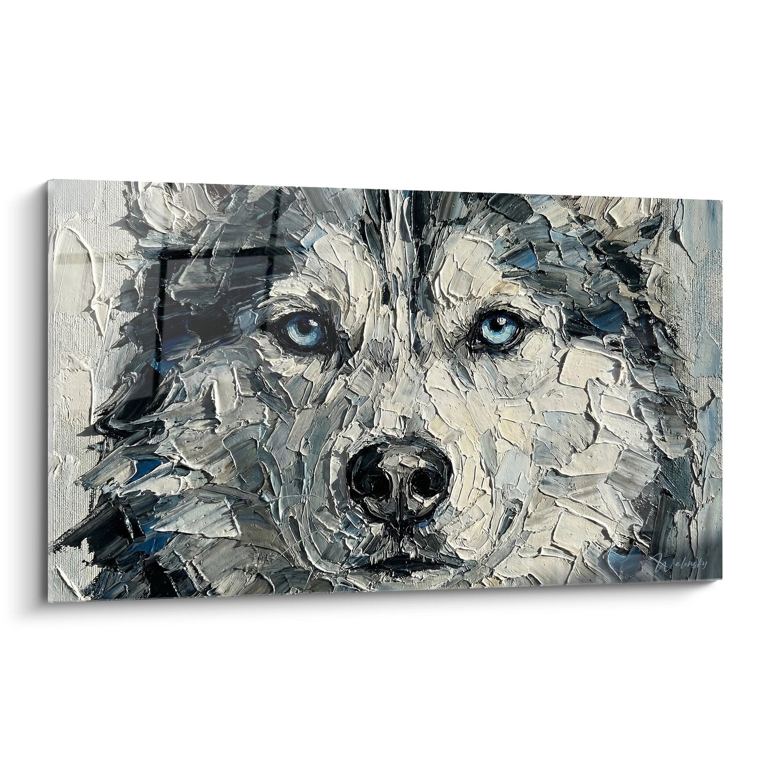 Les yeux bleus glacés de ce tableau créent une connexion émotionnelle immédiate avec le spectateur. Ce regard intense évoque la sagesse ancestrale et la noblesse sauvage du Husky Sibérien, apportant une présence magnétique dans votre intérieur qui fascine et apaise à la fois.