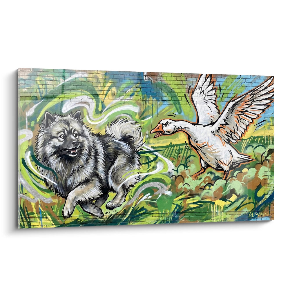 Contrairement aux graffitis urbains agressifs, cette œuvre présente un graffiti artistique aux courbes fluides et aux couleurs apaisantes. Le traitement délicat du Keeshond et la palette chromatique douce en font un choix parfait pour un salon familial, une chambre d'adolescent ou un bureau, apportant modernité sans agressivité visuelle.