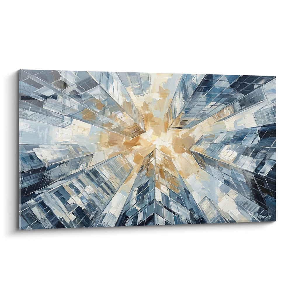 Plongez dans l'univers vertigineux de la métropole avec cette œuvre qui capture l'essence même de l'architecture urbaine. Un éclat doré jaillit du cœur de la composition, transformant votre espace en une fenêtre ouverte sur la grandeur citadine.