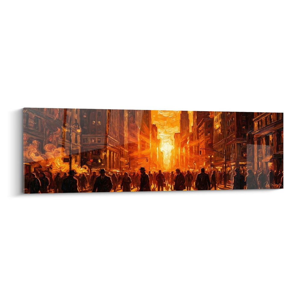 Cette œuvre dévoile une perspective urbaine saisissante où dominent les tons orange et dorés d'un coucher de soleil embrasé. Les façades imposantes des gratte-ciel s'élèvent de chaque côté, créant un corridor architectural majestueux. Au centre de cette artère, une foule dense de silhouettes se détache en contre-jour sombre, formant un contraste dramatique avec l'incandescence ambiante. La lumière dorée irradie depuis le fond de la composition, baignant l'ensemble dans une atmosphère chaleureuse aux reflets cuivrés. Les bâtiments révèlent une architecture typiquement new-yorkaise avec leurs fenêtres géométriques et leurs détails ornementaux finement ciselés. Cette technique picturale aux empâtements généreux confère une texture riche et une profondeur saisissante à l'ensemble.