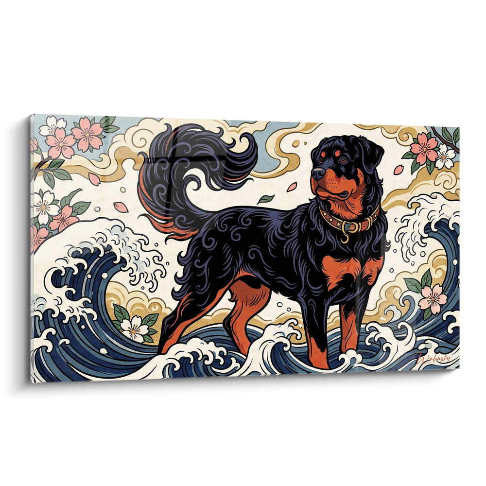 Cette œuvre s'inspire de l'art japonais traditionnel, particulièrement des estampes ukiyo-e. Le chien majestueux se dresse avec fierté sur des vagues stylisées rappelant celles d'Hokusai, créant un pont fascinant entre l'art oriental ancestral et la représentation contemporaine de ce noble compagnon aux couleurs noir et feu caractéristiques.