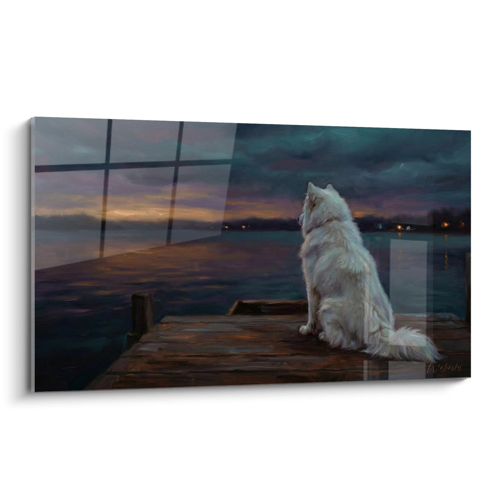 Tableau Chien Blanc Contemplant le Coucher de Soleil sur un Ponton - Sérénité Crépusculaire - Edition Samoyede