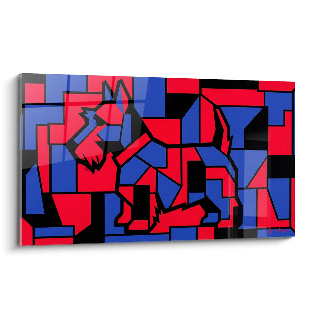 Absolument ! Cette représentation cubiste du Scottish Terrier séduira les passionnés d'art moderne. La déconstruction géométrique de la silhouette canine rappelle les grands maîtres du cubisme, tout en apportant une fraîcheur contemporaine grâce à sa palette chromatique audacieuse de rouge vermillon et de bleu outremer qui dialogue harmonieusement avec les touches noires structurantes.