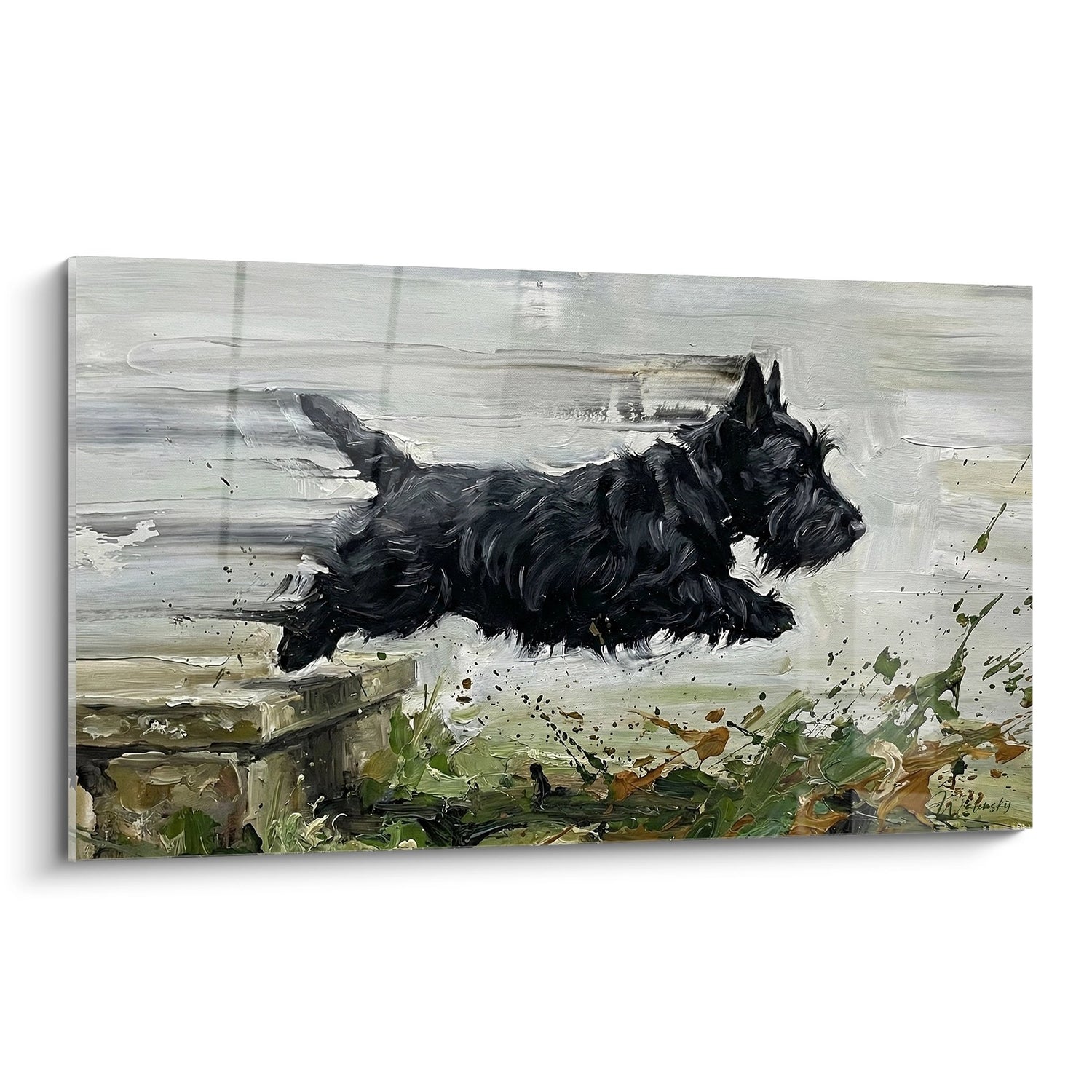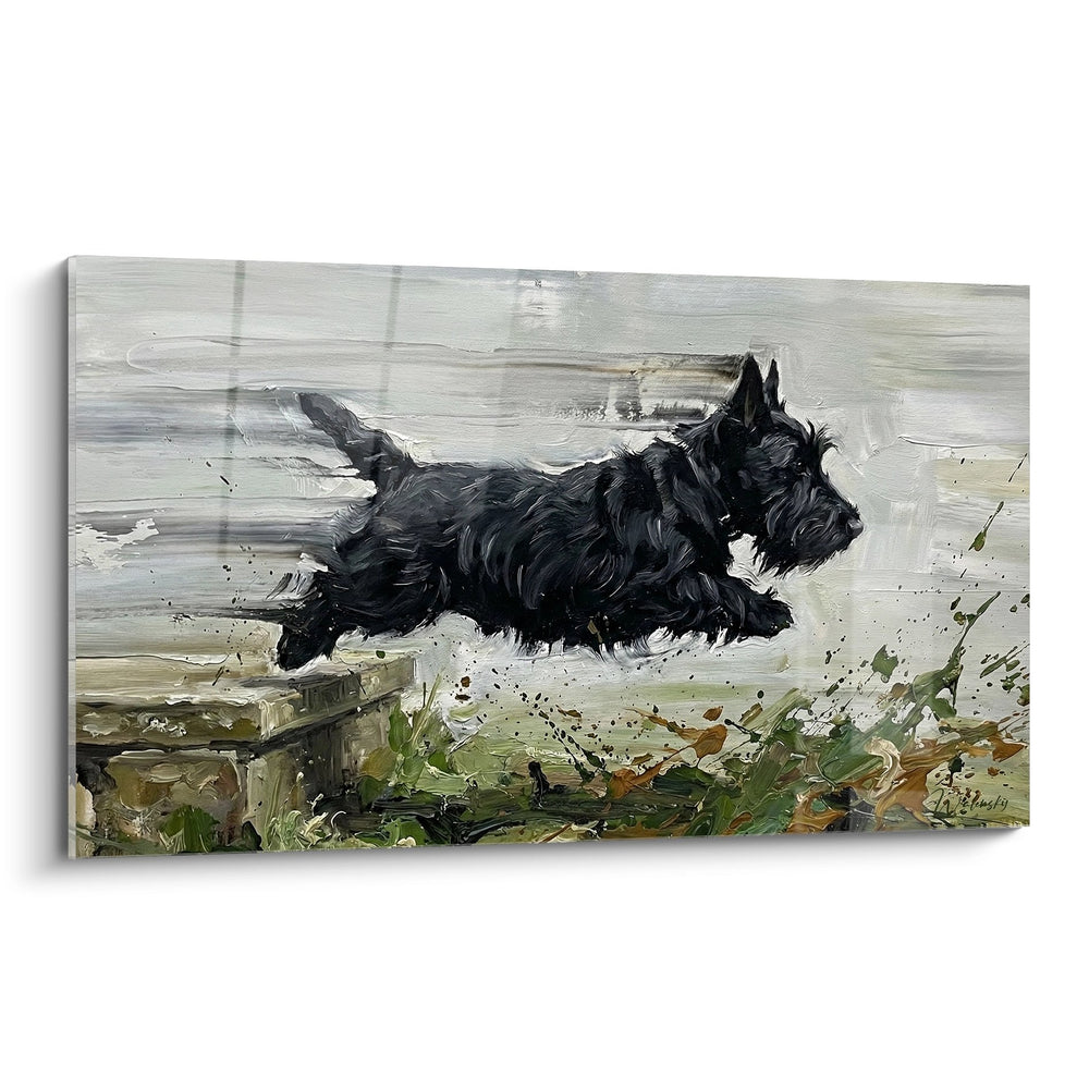 Ce tableau capture l'essence même de la vivacité du Scottish Terrier, immortalisant un moment de pure liberté où l'animal s'élance au-dessus des vagues. L'énergie brute qui se dégage de cette scène évoque l'esprit intrépide et joyeux de cette race, créant une sensation de mouvement perpétuel qui insuffle une vitalité contagieuse à votre espace de vie.