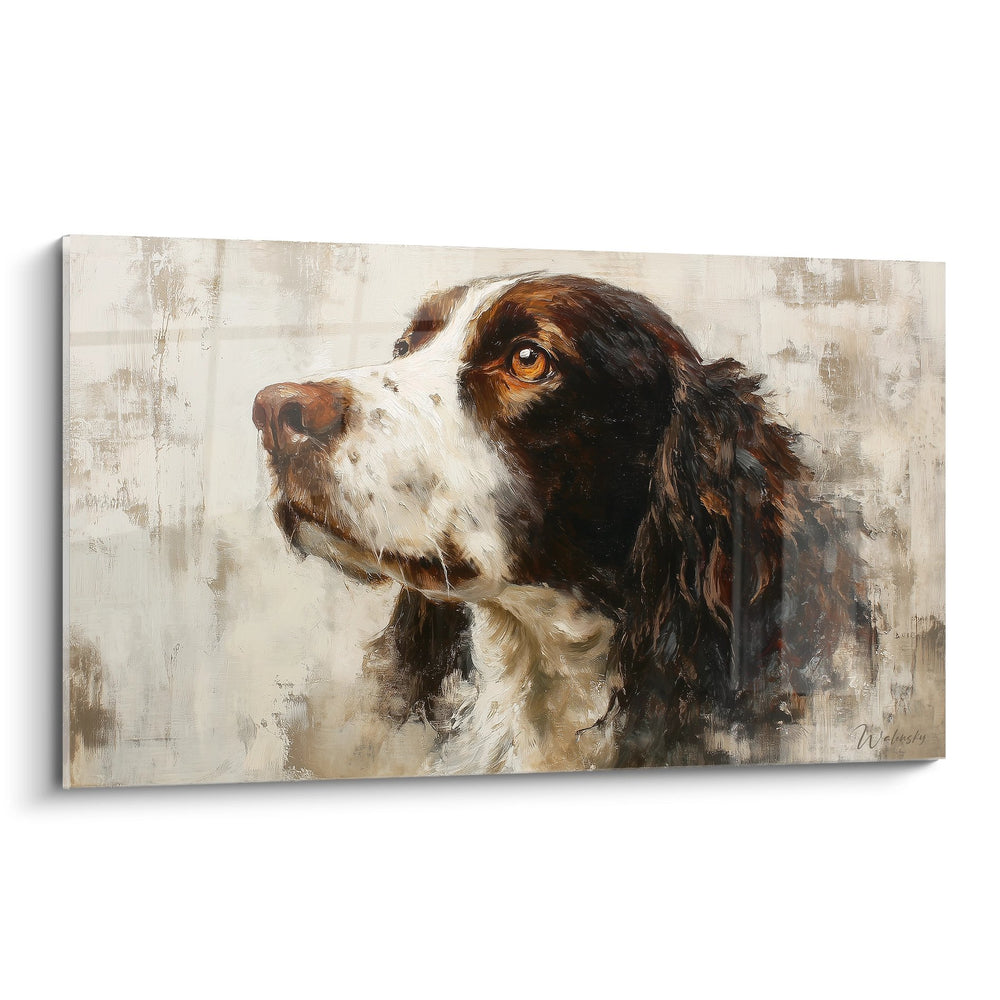 Absolument, ce tableau capture parfaitement la sensibilité du Springer Anglais avec son regard pensif tourné vers l'horizon. L'expression douce et contemplative de ce chien touche directement le cœur des passionnés canins. Les nuances dorées de ses yeux reflètent une profondeur émotionnelle remarquable, créant une connexion instantanée avec l'observateur et évoquant la fidélité légendaire de cette race.