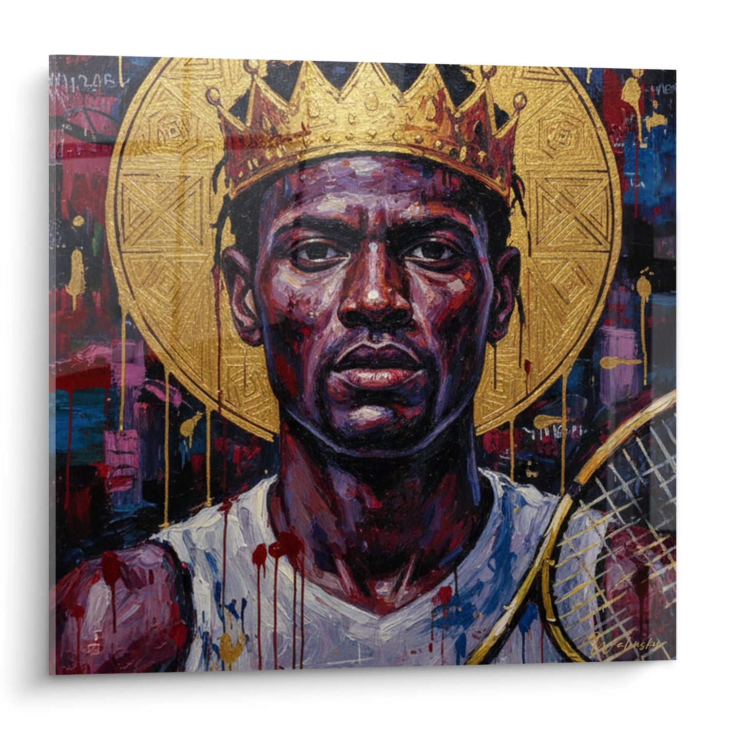 Cette œuvre d'art moderne représente un joueur de tennis dans une esthétique saisissante, mêlant réalisme contemporain et symbolisme royal. L'artiste a créé un portrait puissant d'un champion de tennis, couronné d'une couronne dorée ornementée qui évoque la royauté du sport. Le personnage central, peint dans des tons pourpres et violacés profonds, dégage une intensité remarquable avec son regard perçant et déterminé. Un halo doré nimbe sa tête, renforçant l'aspect quasi-divin du champion. La raquette de tennis, délicatement dorée, est tenue avec assurance, symbolisant la maîtrise technique et l'excellence sportive. Le fond expressionniste, composé de touches de couleurs vives - rouges, bleus, roses - crée un dynamisme visuel qui évoque l'énergie et la passion du tennis de haut niveau. Cette peinture capture parfaitement l'essence de la grandeur sportive et transforme le joueur de tennis en véritable icône artistique.