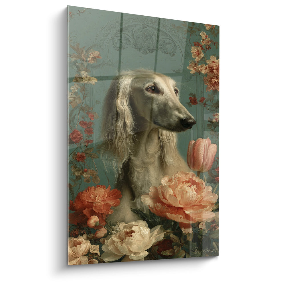 Ist dieses Afghan Hound Porträt für Liebhaber von floraler Romantik geeignet?