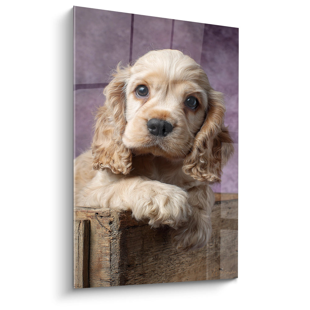 Gemälde goldener Welpe mit blauen Augen in Holzkiste - Hundelichkeit - American Cocker Edition