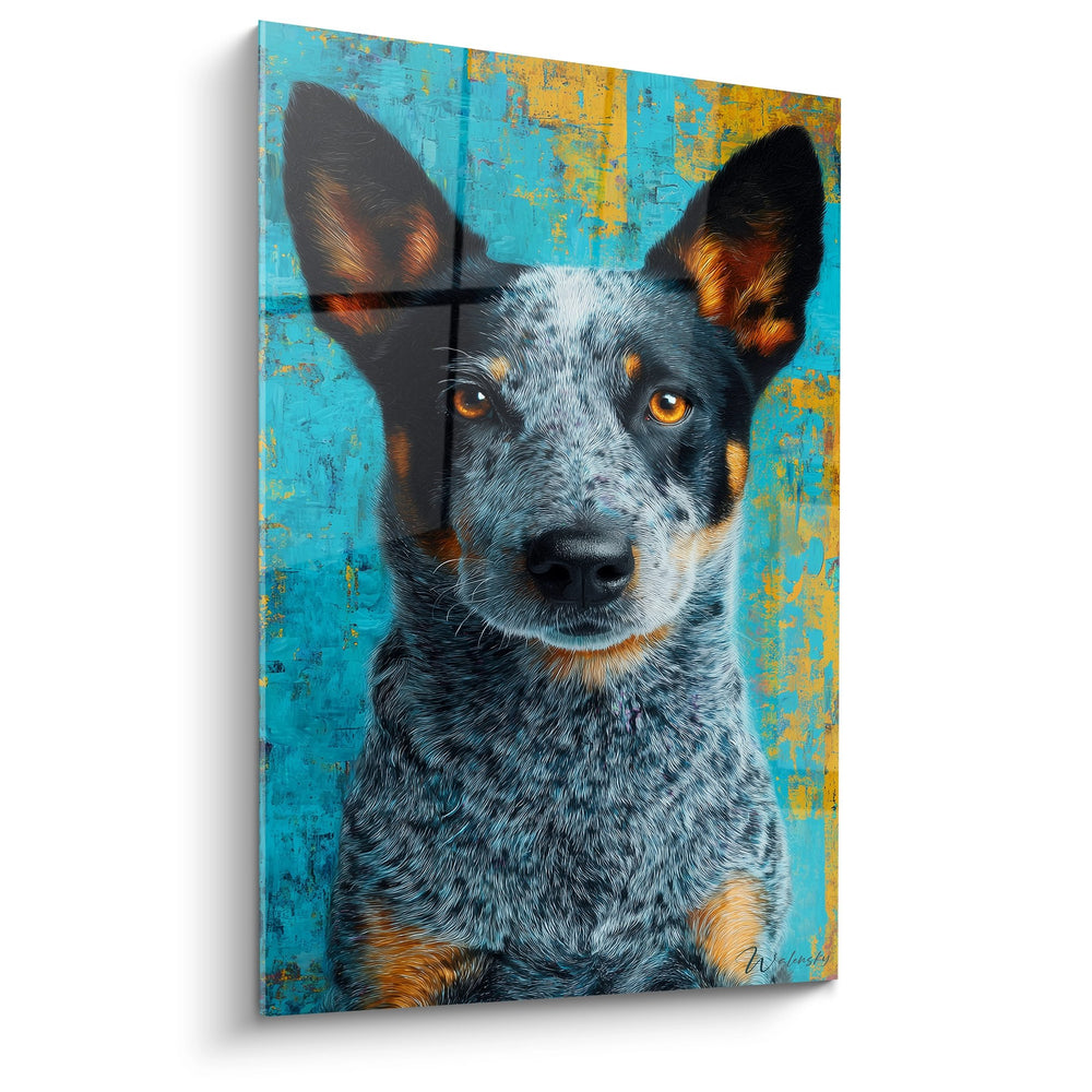 Gemälde Blaugrauer Hund mit Bernsteinaugen auf patiniertem türkisfarbenem Hintergrund - Durchdringender Blick - Australian Cattle Dog Edition