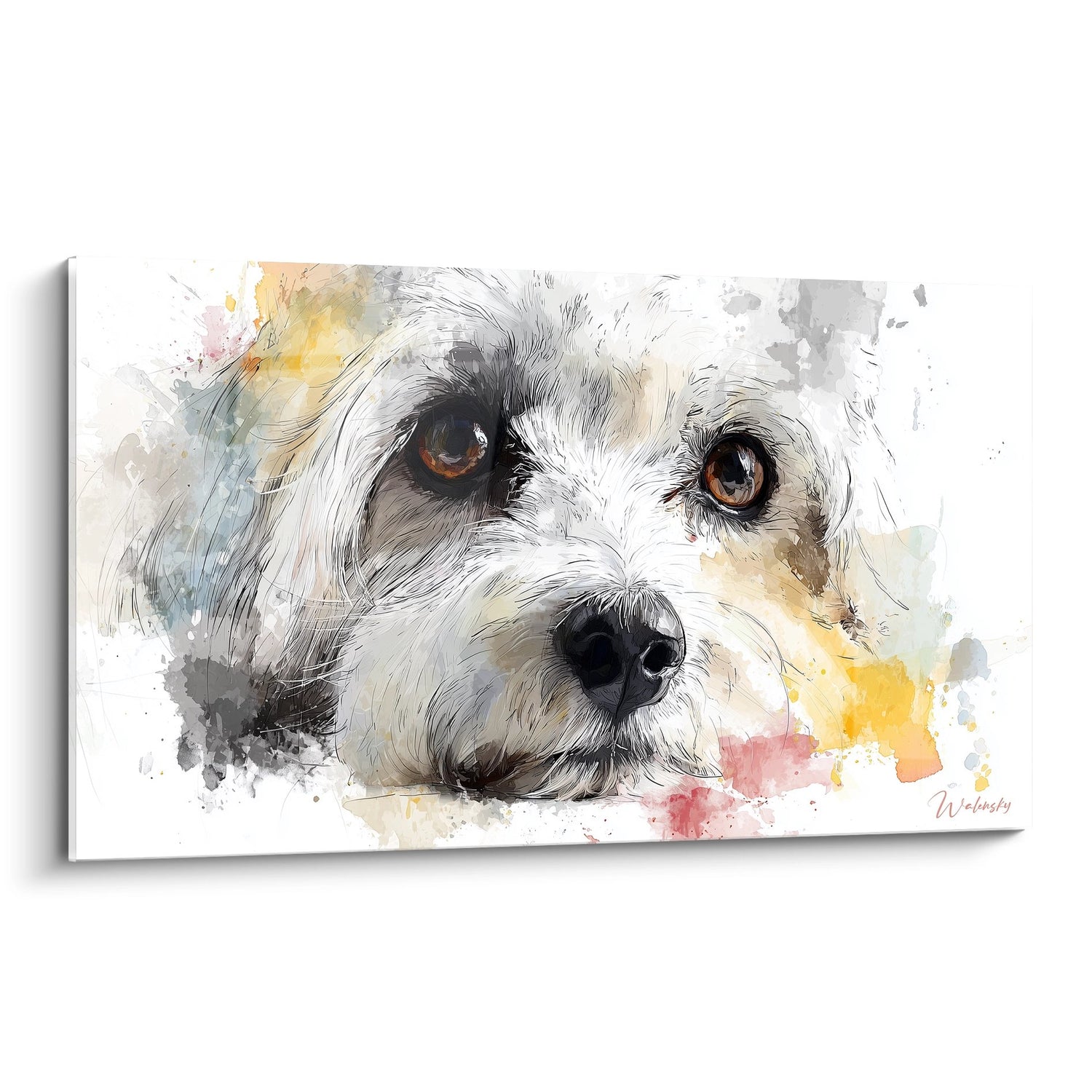 Diese Aquarellakzente in Gelb, Rosa und Blau erzeugen einen Effekt von Bewegung und Vitalität um das Hauptmotiv. Diese moderne Maltechnik kontrastiert bewusst mit dem Realismus des Fells und symbolisiert Lebensfreude und die spritzige Energie, die diese Rasse charakterisiert. Die Farben scheinen um das Porträt zu tanzen, wie sichtbare Gefühle.