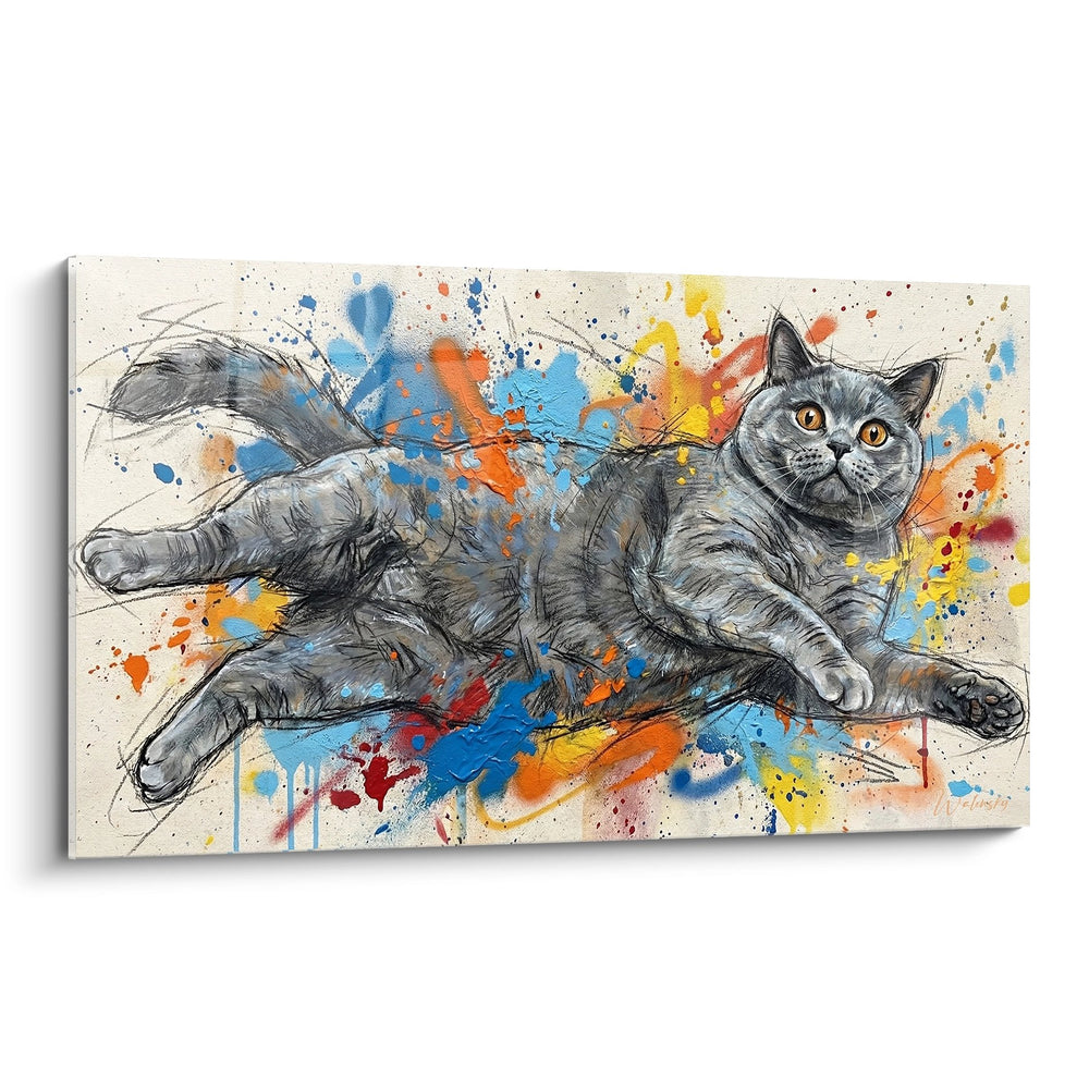 Tauchen Sie in die faszinierende Welt dieses Wandgemäldes ein, das eine British-Kurzhaar-Katze darstellt. Die spritzenden lebhaften Farben schaffen einen Glanz, der Ihrem Interieur echte Vitalität verleiht.