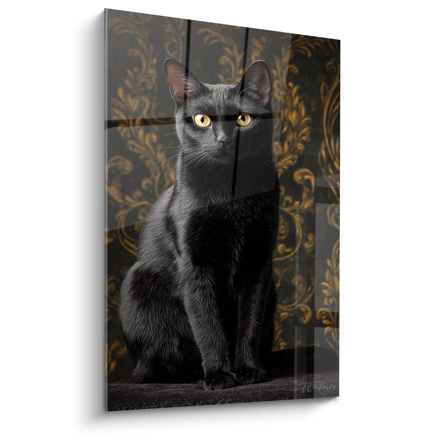 Dieses wunderbare Gemälde zeigt ein fesselndes Porträt einer schwarzen Bombay-Katze in ihrer ganzen Pracht. Das Tier mit seinem charakteristischen glänzenden schwarzen Fell erhebt sich majestätisch vor einem barocken vergoldeten Hintergrund, der die Eleganz klassischer Interieurs ausstrahlt. Ihre bernsteinfarbenen, faszinierenden Augen, wahre leuchtende Juwelen, scheinen die Seele des Betrachters mit verblüffender Intensität zu durchdringen. Der Kontrast zwischen dem Ebenholzmantel des Felins und den goldenem Ornamenten des Hintergrundes schafft eine bemerkenswerte visuelle Harmonie. Dieses Wandkunstwerk erfasst perfekt die natürliche Anmut und das verführerische Geheimnis der Bombay-Katze, einer Rasse, die für ihr liebenswürdiges Temperament und ihr vornehmes Aussehen bekannt ist. Die akribischen Details des glänzenden Fells und die Feinheit der Katzenmerkmale zeugen von hochwertiger künstlerischer Arbeit und sind ideal, um Ihre Inneneinrichtung zu verfeinern.