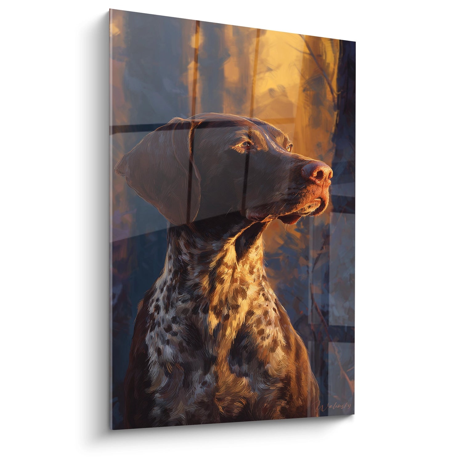 Absolut! Dieses Kunstwerk erfasst wunderbar die goldenen Reflexe der Abendsonne auf dem Fell dieses edlen Jagdhundes. Die Bernstein- und Kupfertöne schaffen eine warme Atmosphäre, die alle anzieht, die natürliche Beleuchtung und goldene Ambiance in ihrem Interieur schätzen.