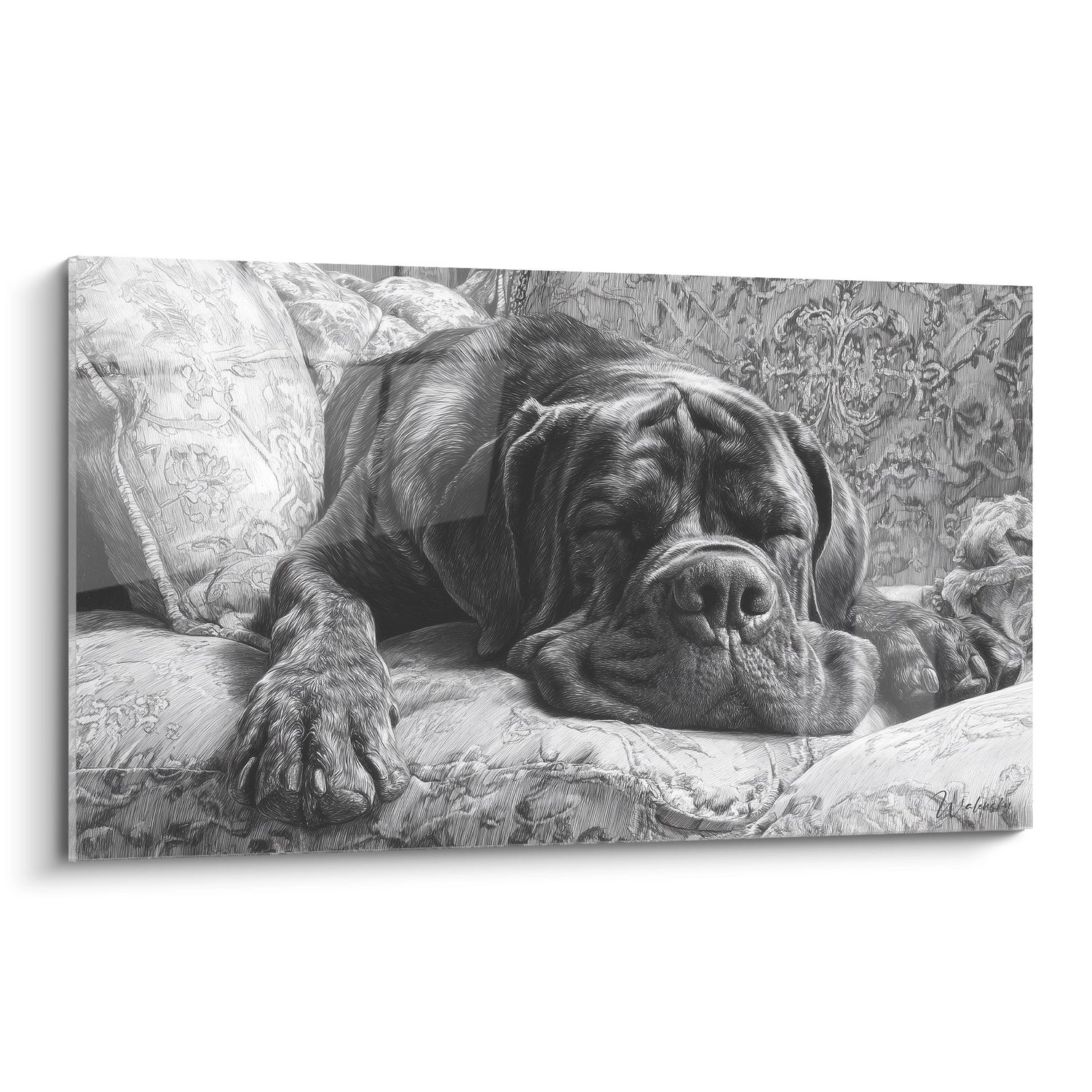 Absolut! Dieses Kunstwerk erfasst perfekt das Wesen wohlverdienter Ruhe. Die schlafende Englische Dogge vermittelt ein Gefühl tiefster Ruhe, ideal für Menschen, die Entspannungsmomente schätzen und einen ruhigen Raum in ihrem Zuhause schaffen möchten. Die entspannte Haltung des Hundes lädt natürlicherweise zur Entspannung ein.
