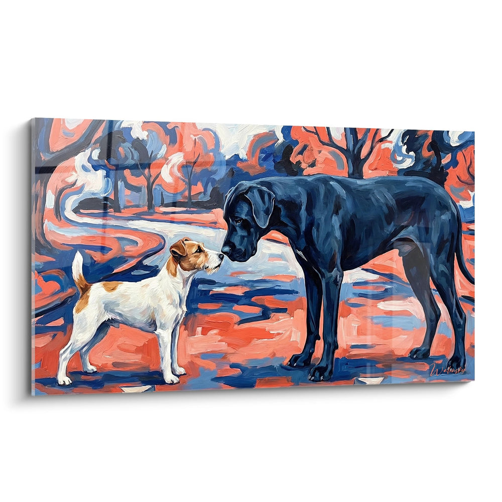 Absolut! Dieses Werk fängt den magischen Moment einer ersten Begegnung zwischen zwei Hunden perfekt ein. Der kleine weiß-braune Hund gegenüber dem großen schwarzen Hund illustriert wunderbar die interspezifische Freundschaft. Diese rührende Szene ruft gegenseitige Neugier und Offenheit füreinander auf – universelle Werte, die alle Tierliebhaber ansprechen werden.