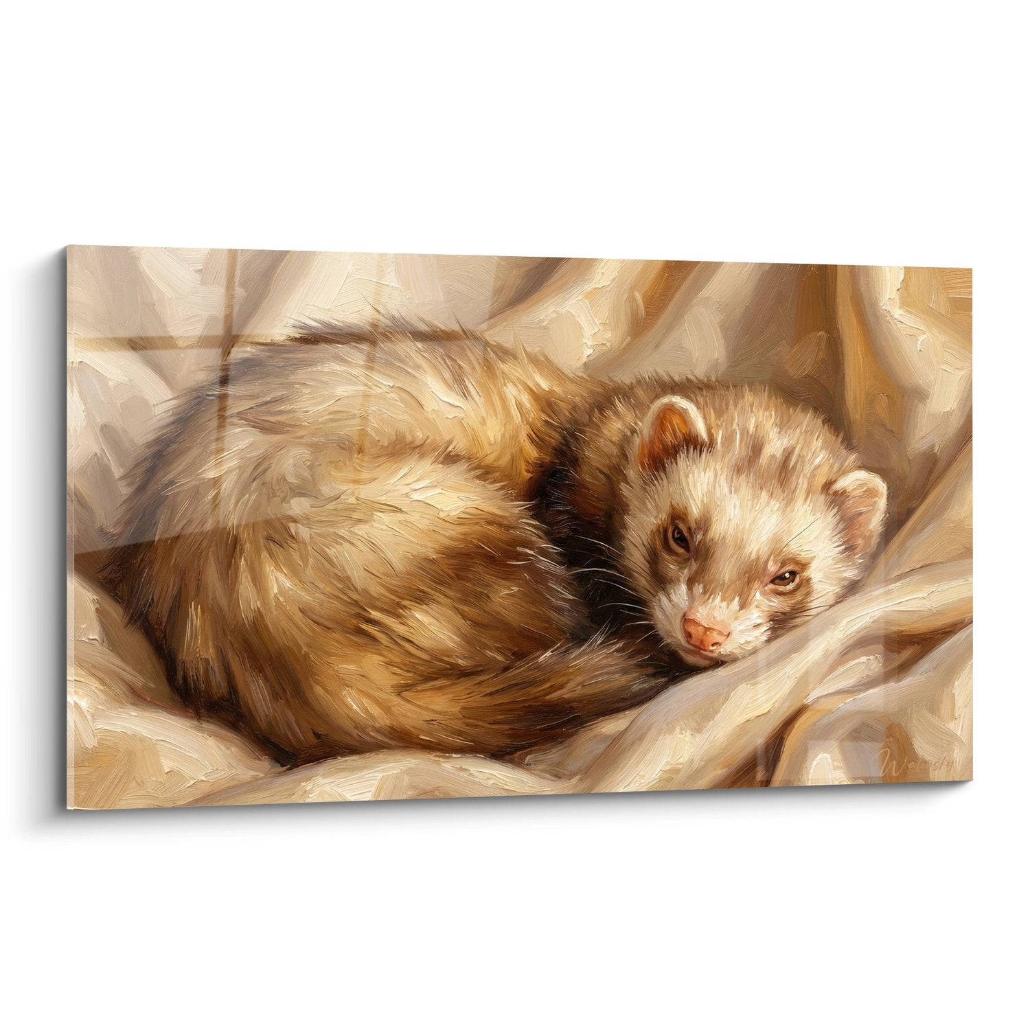 Dieses Kunstwerk erfasst einen Moment absoluter Ruhe, mit dem kleinen Tier gemütlich in weiche Stoffe gebettet. Die Gold- und Beigetöne schaffen eine beruhigende Atmosphäre, die zur Entspannung einlädt. Die friedliche Körperhaltung des Frettchens vermittelt ein Gefühl des Wohlbefindens und der Stille, ideal für Räume, die dem Ausruhen und der Entspannung gewidmet sind.