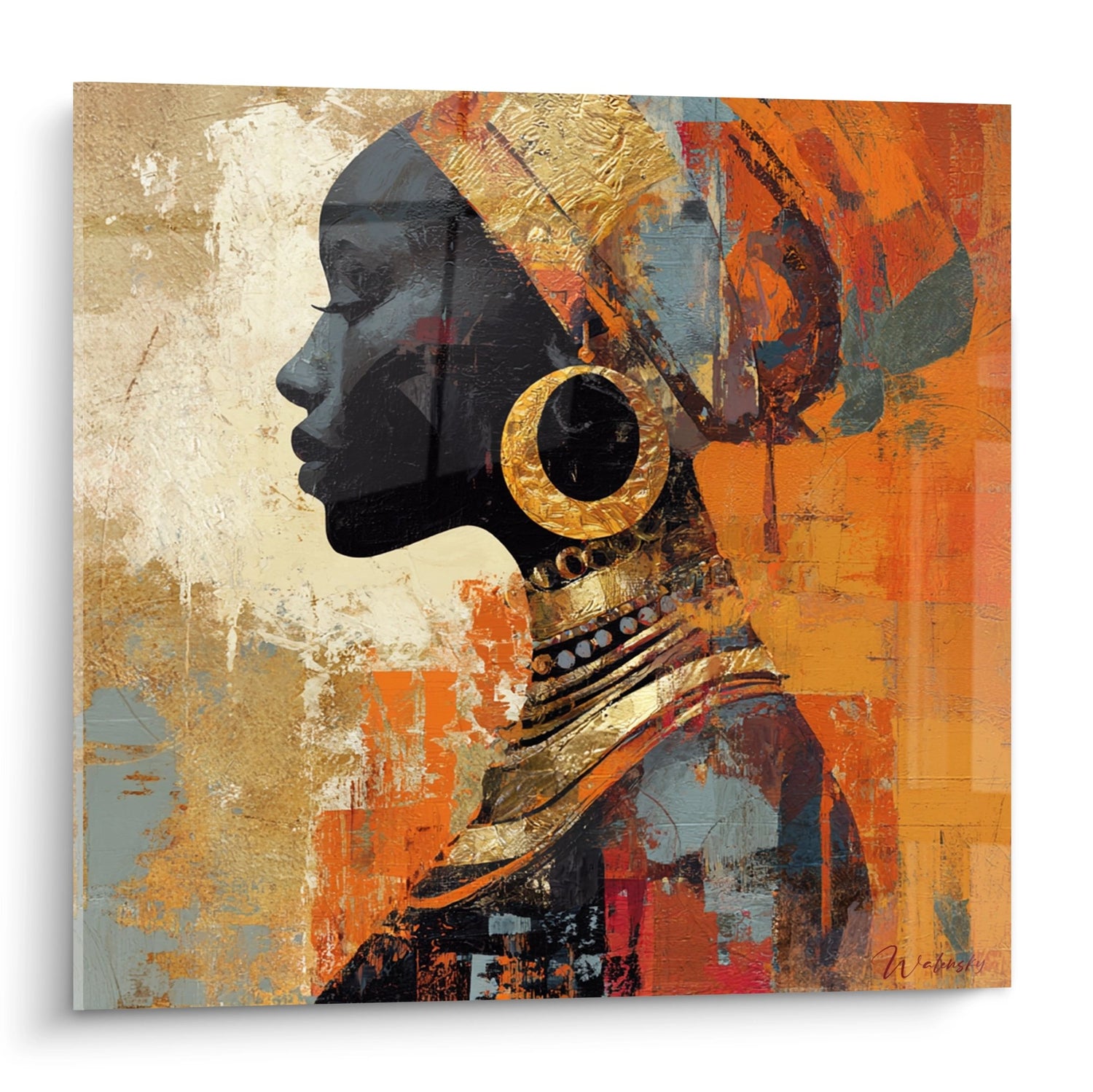 Dieses fesselnde Kunstwerk zeigt ein stilisiertes afrikanisches Profil in einer modernen und ausdrucksstarken Komposition. Das weibliche Gesicht, als dunkle Silhouette dargestellt, hebt sich wunderbar vor einem mit Texturen und warmen Farben reichen Hintergrund ab. Der Künstler hat meisterhaft goldene, orangefarbene und ockerfarbene Töne gemischt, um eine vibrierende Atmosphäre zu schaffen, die die Wärme des afrikanischen Kontinents hervorruft. Traditionelle Schmuckstücke, insbesondere große vergoldete Kreisohrringe und eine Perlenkette, verleihen dieser Darstellung eine authentische Dimension. Die verwendete Mischtechnik kombiniert Malerei, Collage und strukturierte Elemente, die dem Gesamtwerk bemerkenswerte Tiefe verleihen. Geometrische Muster und Impasto schaffen einen visuellen Dialog zwischen Tradition und Moderne und machen dieses Gemälde zu einer zeitgenössischen Feier des afrikanischen Kulturerbes.