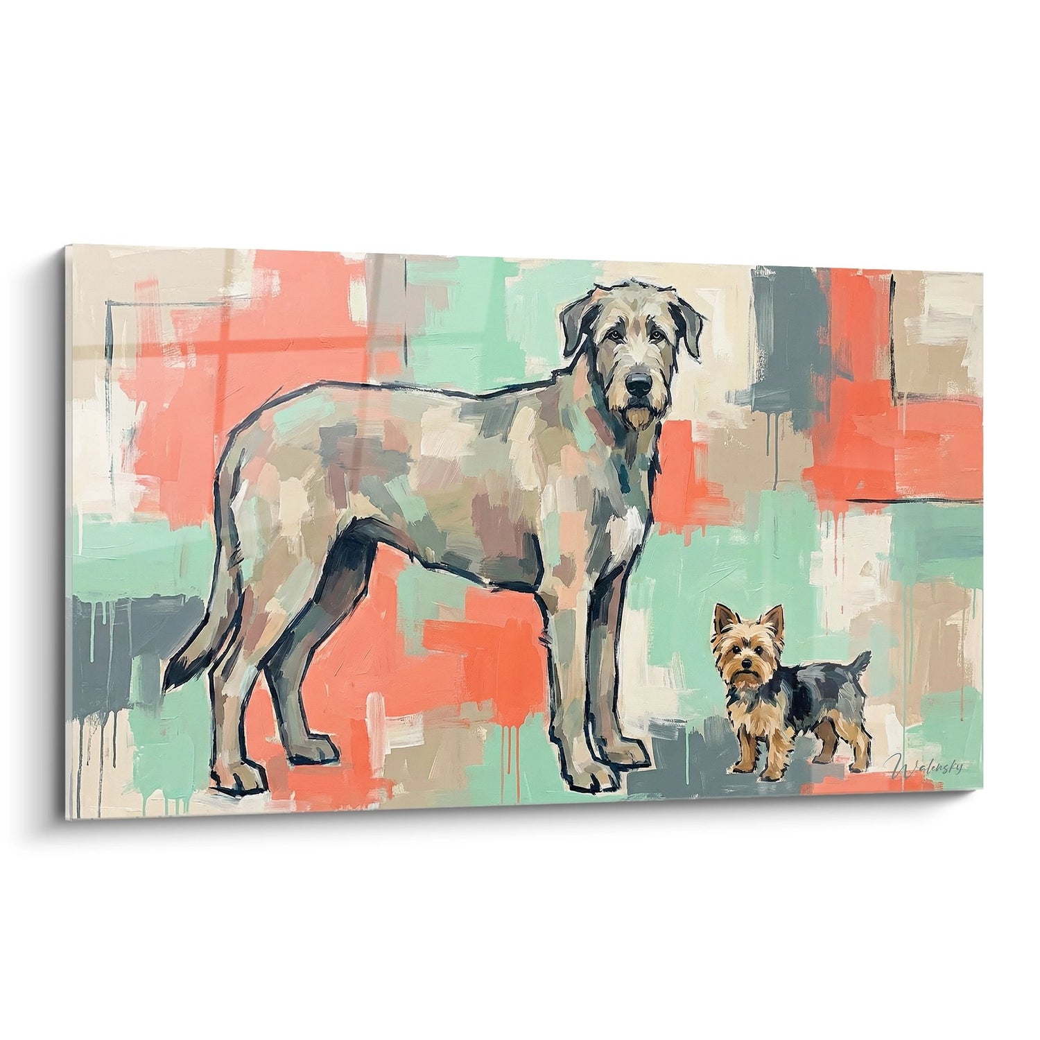 Irish Wolfhound Majestätisches und Yorkshire Terrier auf abstrakter Leinwand Koralle und Minze – Hundekontrast – Edition Irish Wolfhound