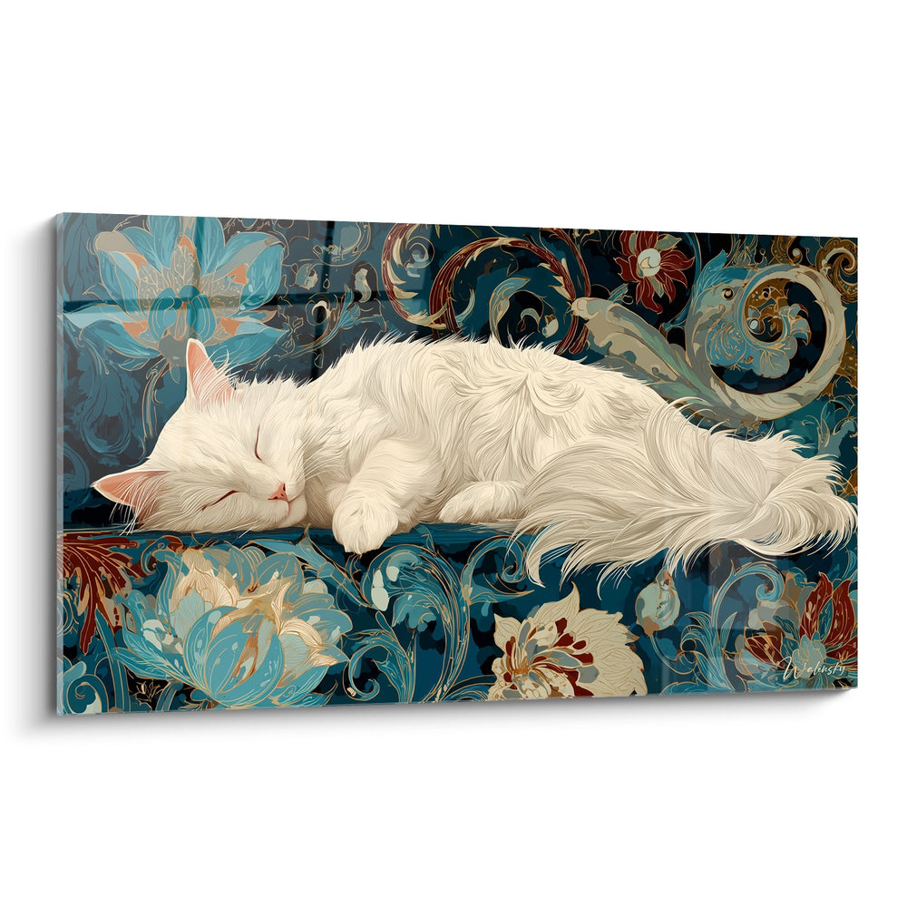 Dieses Wandkunstwerk erfasst die friedliche Anmut einer weißen Türkischen Angora-Katze in einem Moment absoluter Ruhe. Das Tier mit seinem seideweichen und makellosen Fell ruht zart auf einem prachtvollen Teppich aus ornamentalen Blumenmotiven. Seine geschlossenen Augen und sein heiterer Gesichtsausdruck vermitteln ein tiefes Gefühl von Stille und Wohlbefinden. Der fesselnde Kontrast zwischen der Reinheit des weißen Fells der Türkischen Angora und der dekorativen Fülle des Hintergrunds schafft eine harmonische und beruhigende Komposition. Die feinen Details des langen, fließenden Fells dieser emblematischen Felinen-Rasse werden mit bemerkenswerter Präzision dargestellt und unterstreichen die natürliche Eleganz dieser außergewöhnlichen Katze. Diese künstlerische Darstellung würdigt die kontemplative Schönheit der Türkischen Angora und verwandelt einen einfachen Ruhemoment in ein echtes Meisterwerk zum Verschönerung Ihres Interieurs.