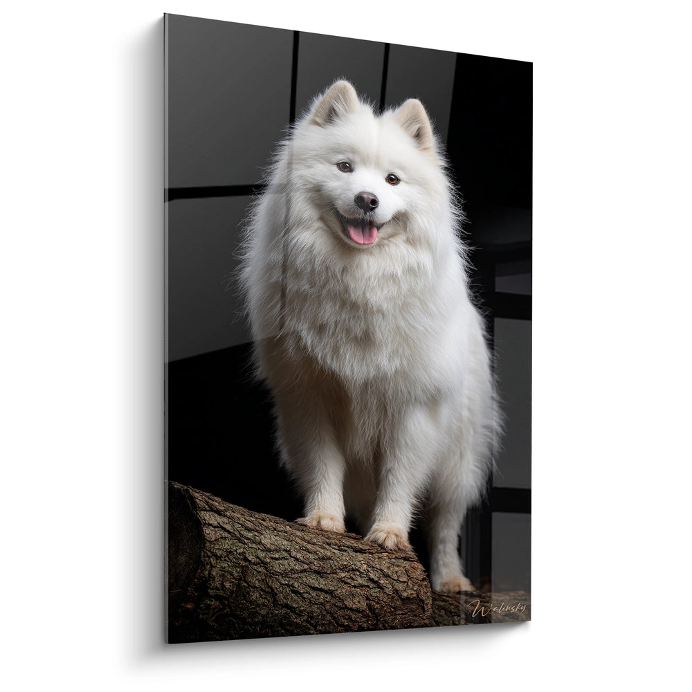 Gemälde Weißer Hund Seidentweiches Fell auf Baumstamm - Strahlendes Porträt - Spitz Japanisch Edition