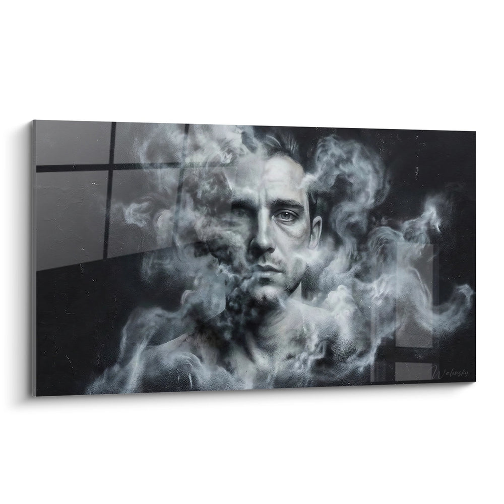 Dieses ergreifende Werk präsentiert ein männliches Gesicht mit markanten Zügen, eingehüllt in eine Wolke aus grauem und weißem Rauch mit organischen Voluten. Die monochrome Palette dominiert mit tiefen Anthrazittönen, die mit den leuchtenden Weiß des Rauchs kontrastieren. Das rechte Auge des Charakters, besonders intensiv, durchbricht den Nebeldunst, um direkten Kontakt mit dem Betrachter herzustellen. Lichtelspiele erzeugen dramatische Schatten auf dem Gesicht und verstärken den ernsten und kontemplativen Ausdruck. Die dampfige Textur des Rauchs bringt eine ätherische und mystische Dimension zu dieser zeitgenössischen urbanen Komposition. Der dunkle Hintergrund hebt die ergreifenden Kontraste zwischen Schatten- und Lichtzonen hervor.