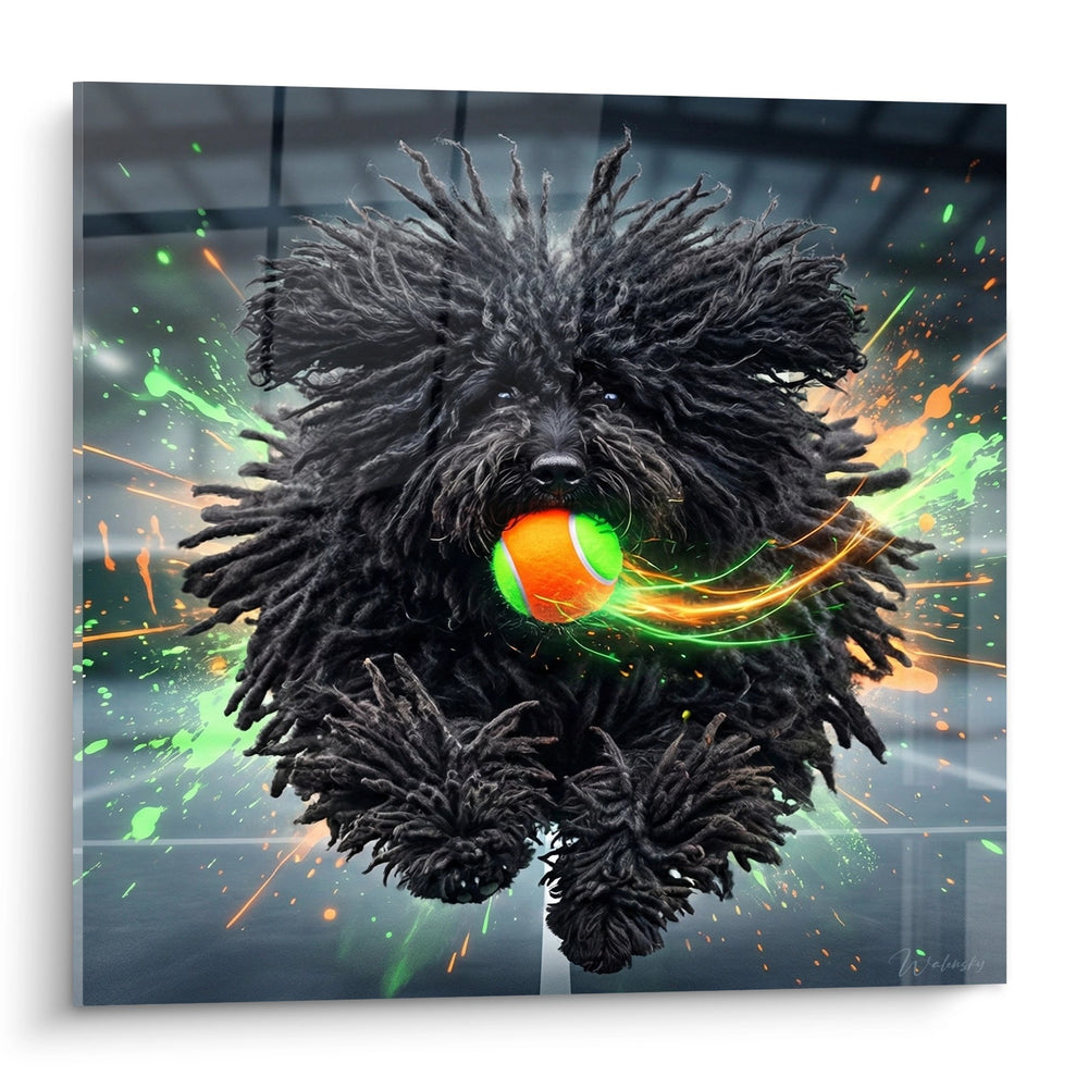 Hundegemälde mit schwarzen Dreadlocks und leuchtender Kugel - Explosive Energie - Puli-Edition