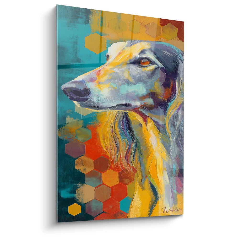 Windhund-Gemälde mit lebhaften Farben und Sechskant-Motiven - Zeitgenössisches künstlerisches Porträt - Saluki Edition