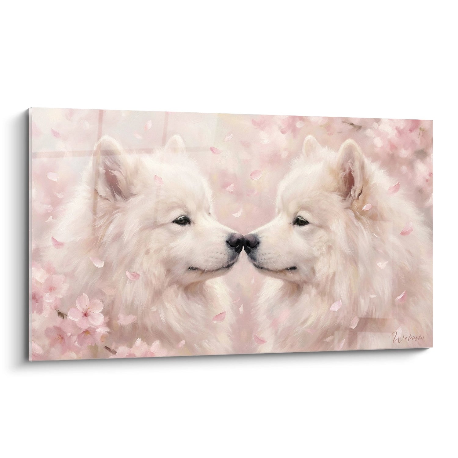 Die Nuancen von pudrigem Rosa und Gebrochenweiß, die diese beiden Samojeden umhüllen, schaffen eine außergewöhnlich sanfte chromatische Harmonie. Diese Pastell-Palette erinnert an die Gelassenheit japanischer blühender Gärten und vermittelt ein unmittelbares Gefühl der Ruhe. Der beruhigende Effekt wird durch die schwebenden Blütenblätter verstärkt, die einen Eindruck von in der Zeit suspendierter Bewegung erzeugen.